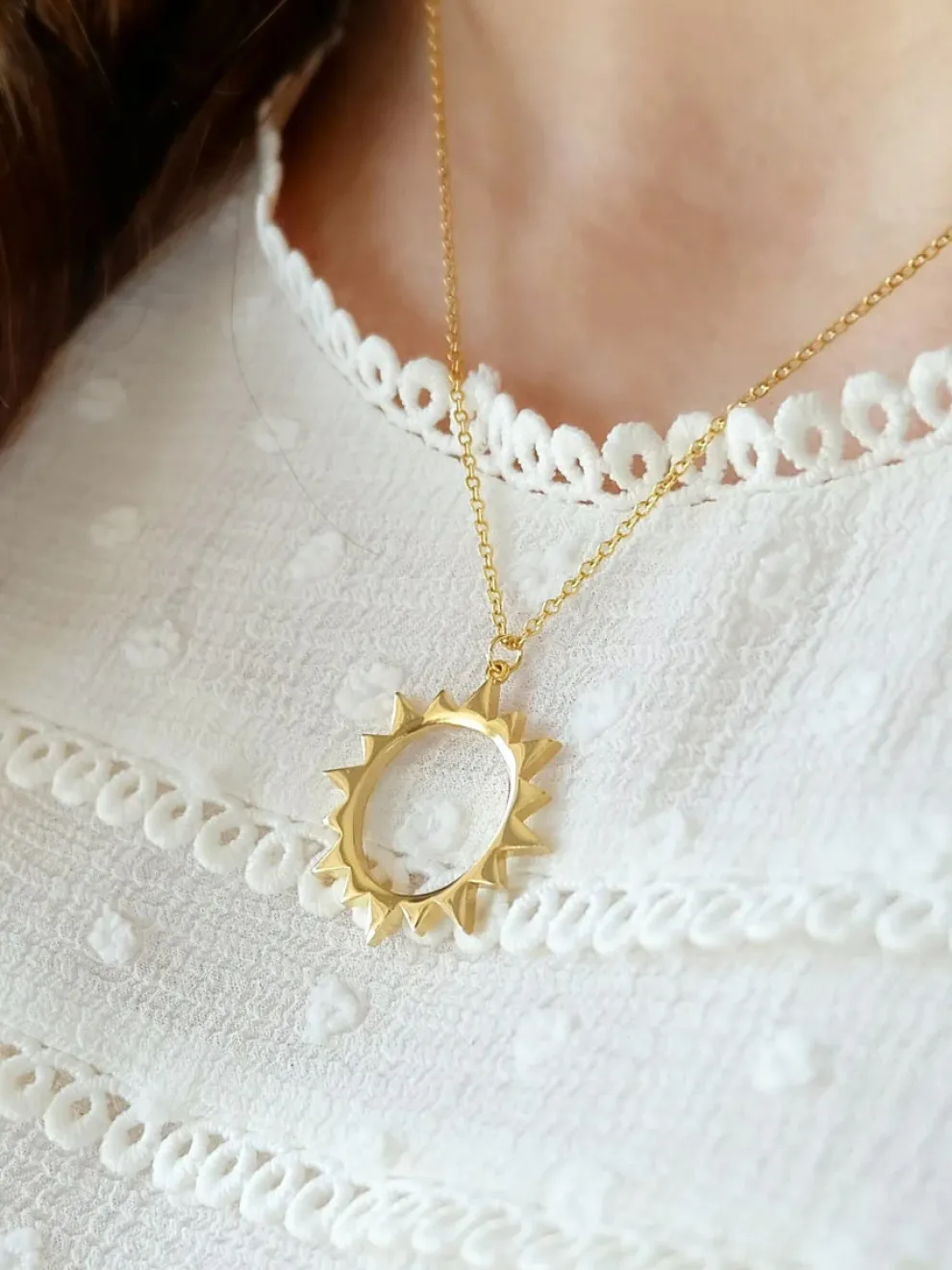 Channel the radiant energy of Aelia, the Sun Goddess, with this abstract sun necklace. Its minimalist design adds a subtle glow to any look, making it a thoughtful gift or a timeless piece for your own collection.
