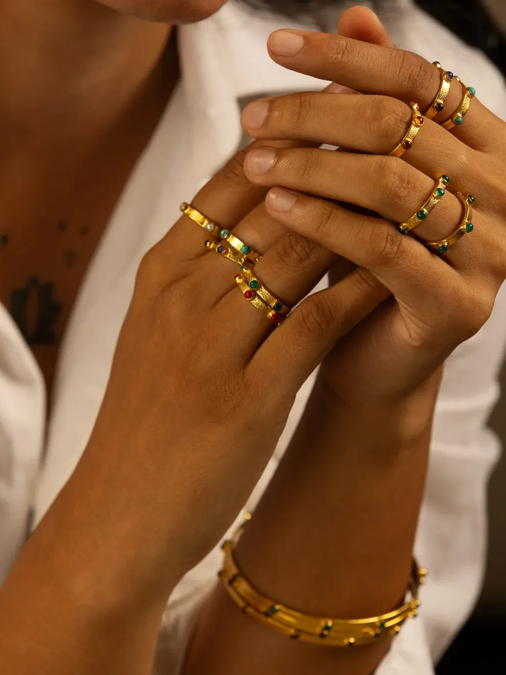 Create your own unique style with Goddess Charms’ fully adjustable, stackable rings. Hand hammered to catch the light with eye-catching semi-precious gemstones and dazzling 18ct gold.