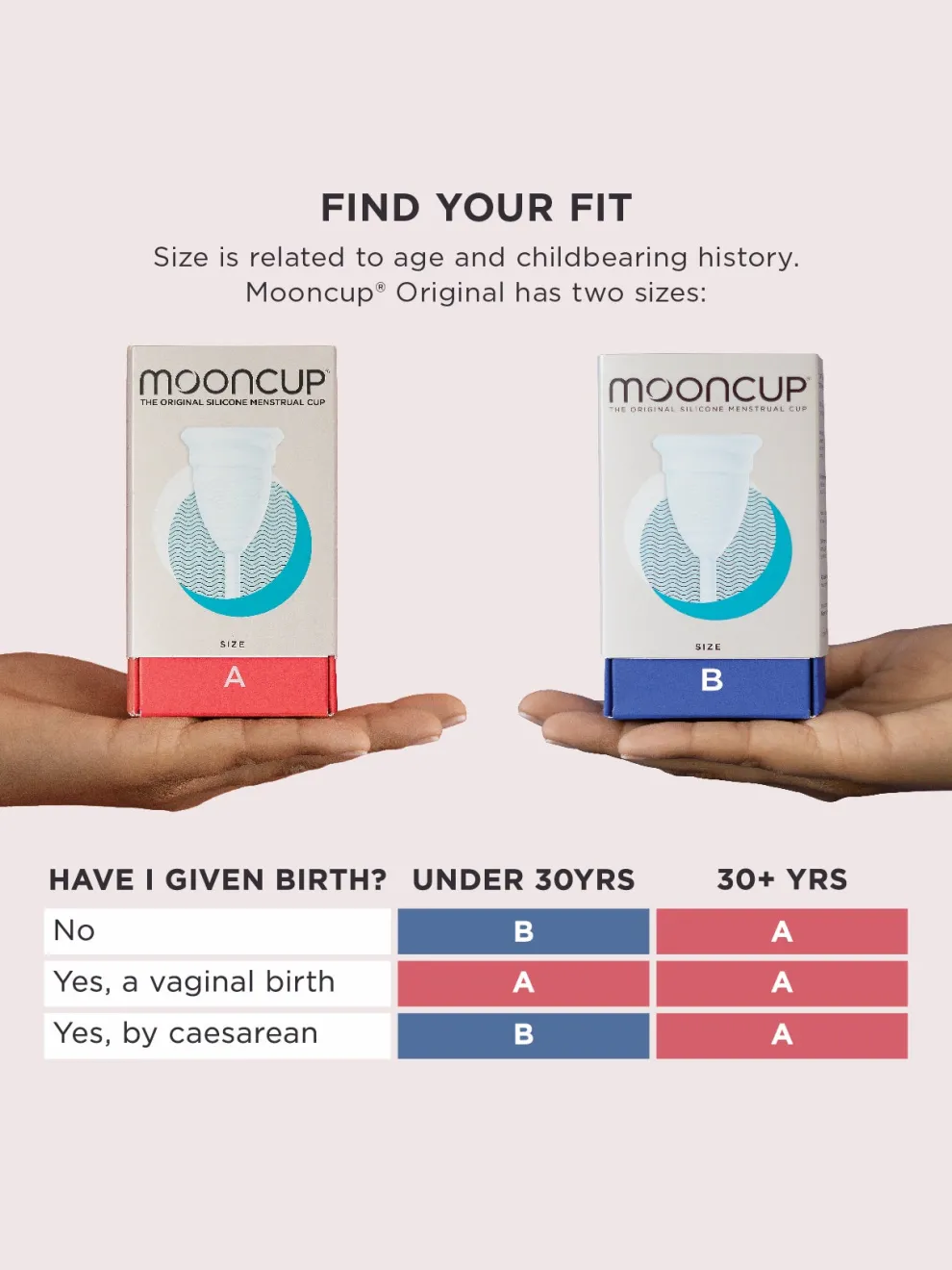 - Mooncup size A is recommended for those who are 30 and over, and all who have given birth vaginally regardless of age