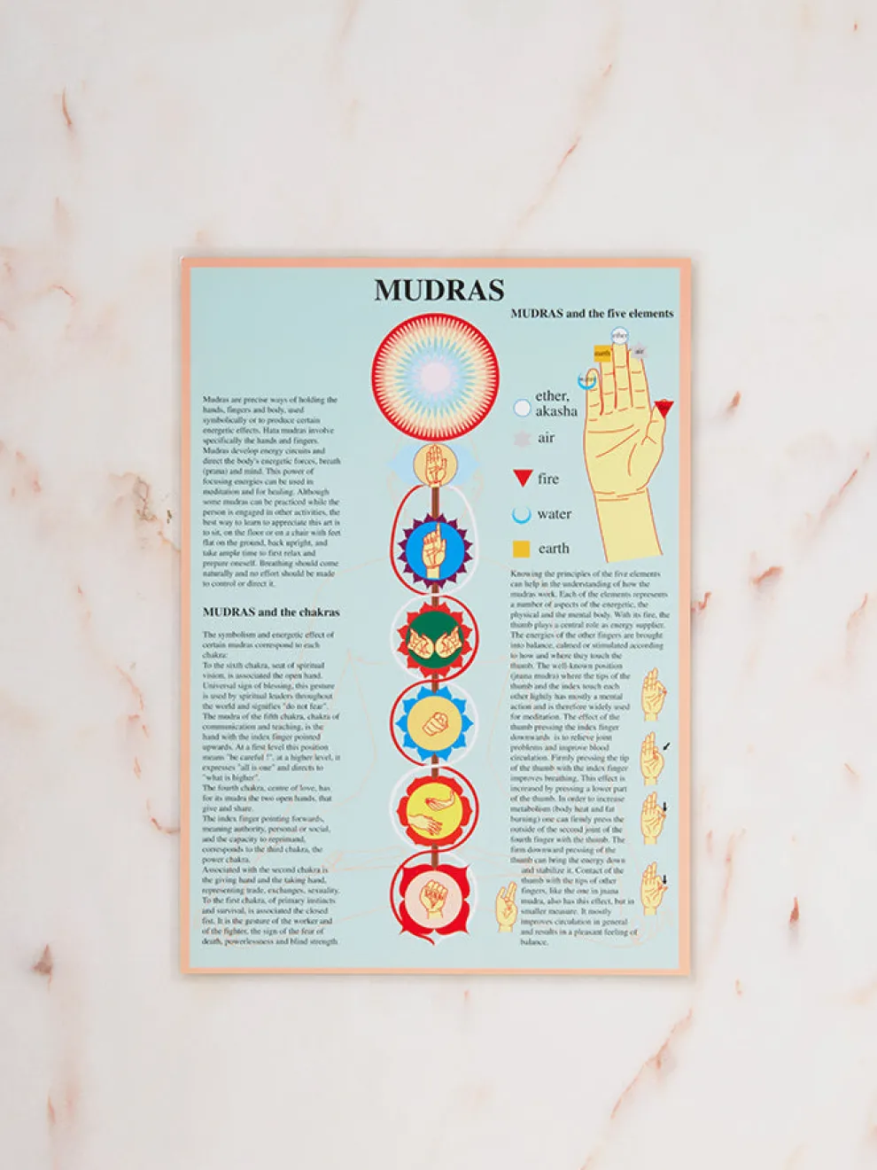 Mudras and the five elements. Double sided A4 full-colour laminated poster packed with images and information. This chart explains how to use mudras, gives original information about the elements associated with each finger and the mudras working with each of the seven main chakras. On the back of the chart is a description of the 14 best known and most useful mudras.