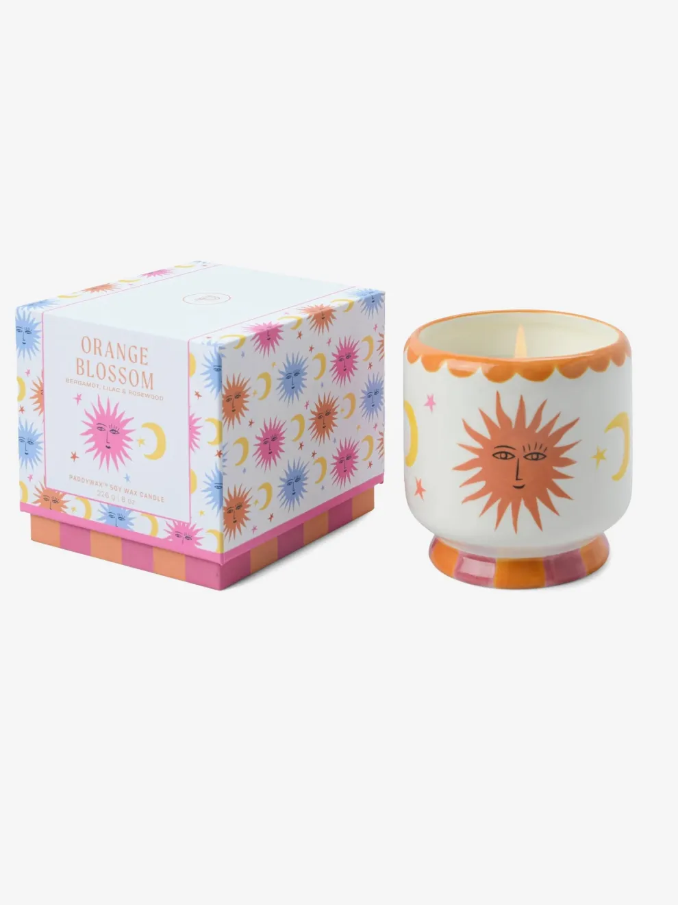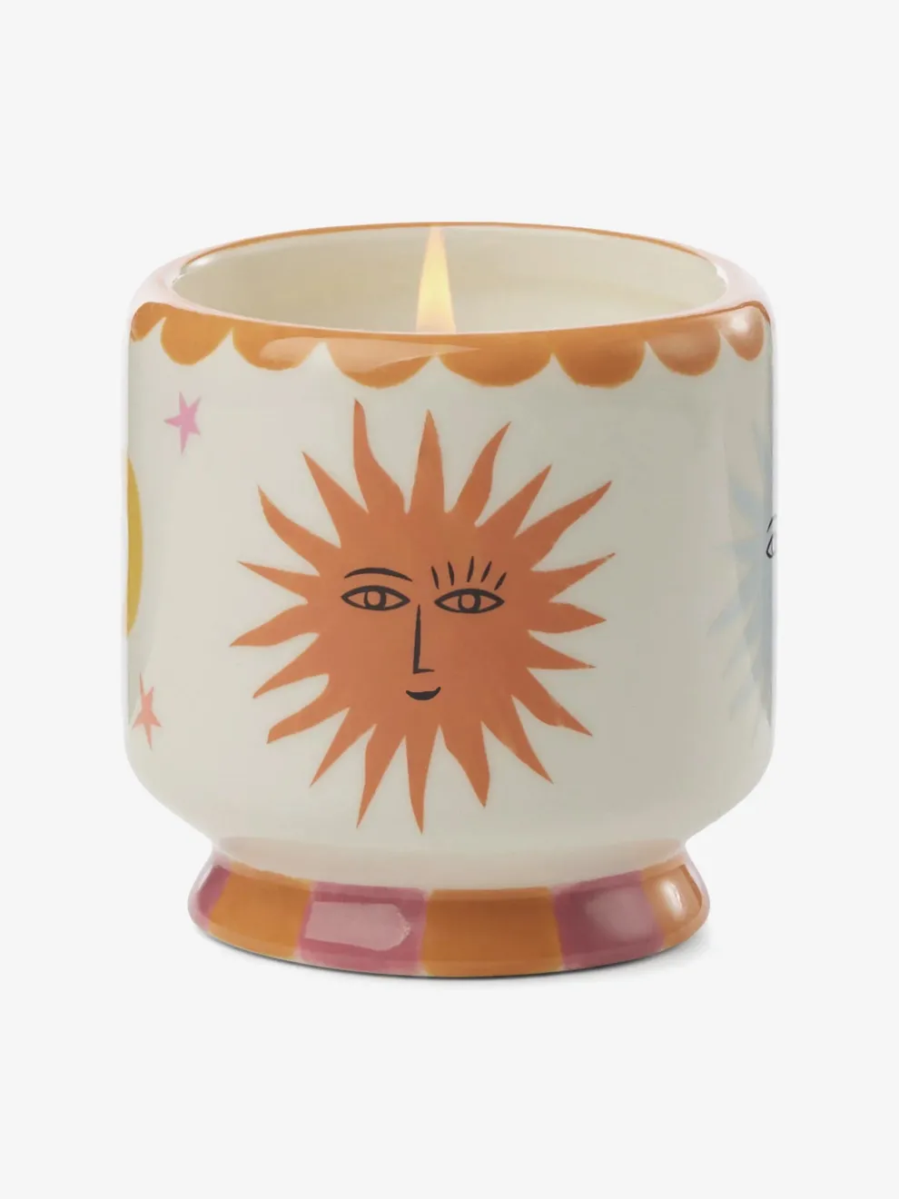 Adopo is designed to bring the zest and thrill of a summer abroad to the comfort of indoor spaces. Featuring the vibrant hues and inviting patterns of Morocco, each 8oz/226g ceramic vessel is meticulously hand-painted with individual brushstrokes for an artisan feel, each one including a matching hand drawn dust cover and adventurous fragrance.