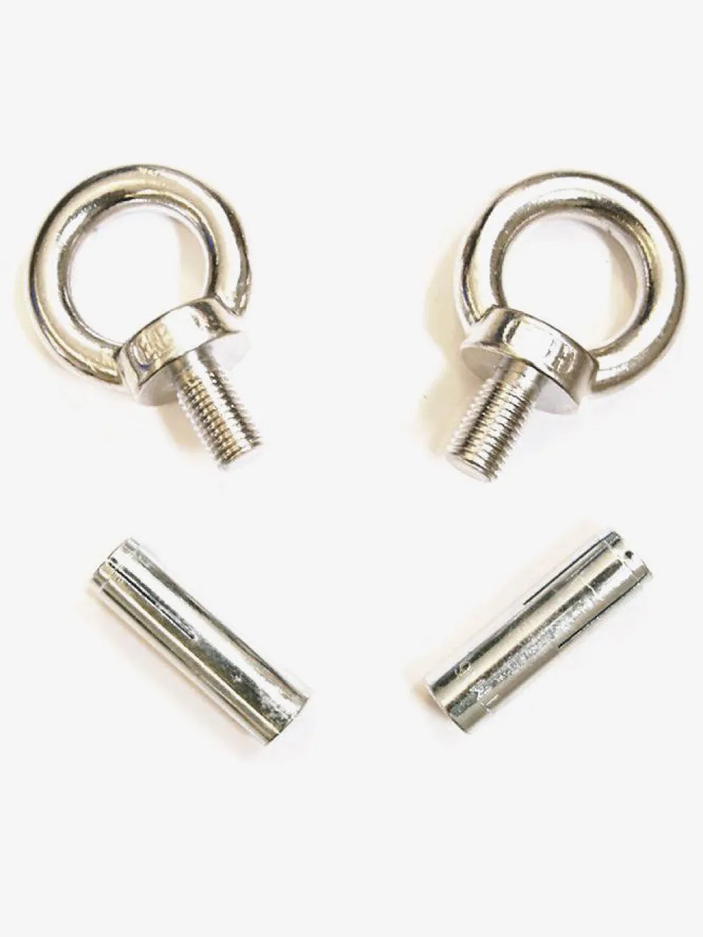Two stainless steel M16 eyebolts plus drop in anchors for fixing into stone and masonry walls for your yoga ropes.