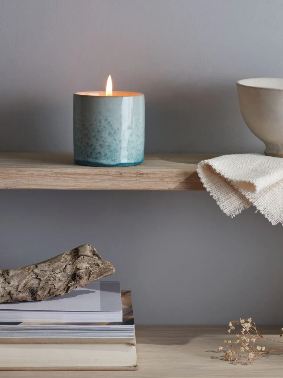 - Ceramic vessel. Vegetable and mineral wax blend, combination of essential oils and nature identical fragrances with lead-free cotton wicks.
