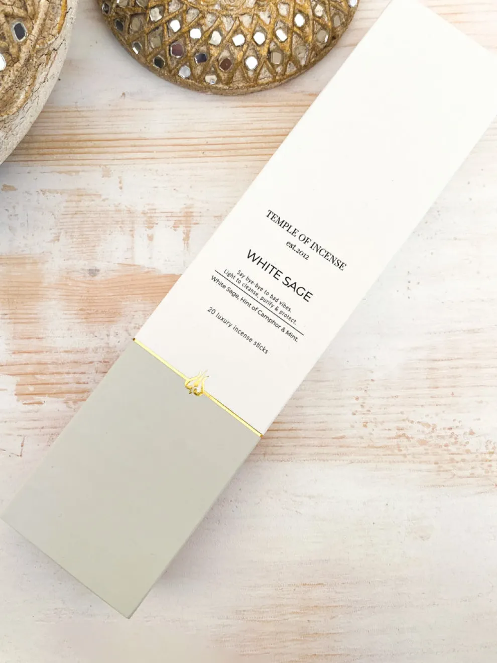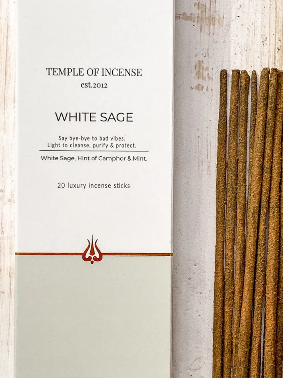 Say goodbye to bad vibes. Light these Temple of Incense white sage incense sticks to cleanse, purify and protect. All the benefits of sage, with the lift of camphor and mint for an overall more pleasant scent.
