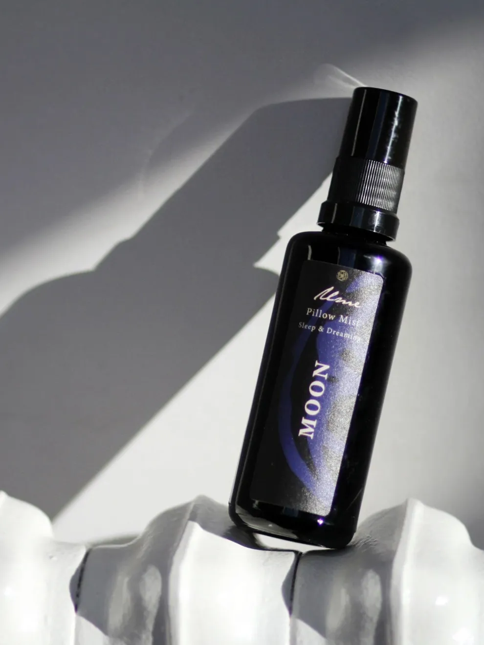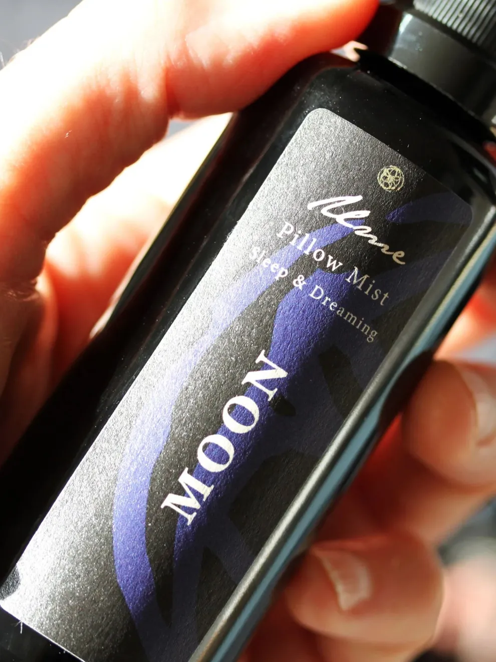 Moon Pillow Mist is made with magical organic essential oils of Yarrow, Mugwort, high altitude Provencal Lavender and Frankincense. This magical blend of oils, infused in moonstone crystal spring water, has a deeply calming effect on the body whilst allowing the mind to drift into deep states of sleeping and dreaming.