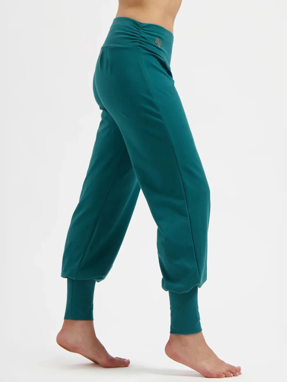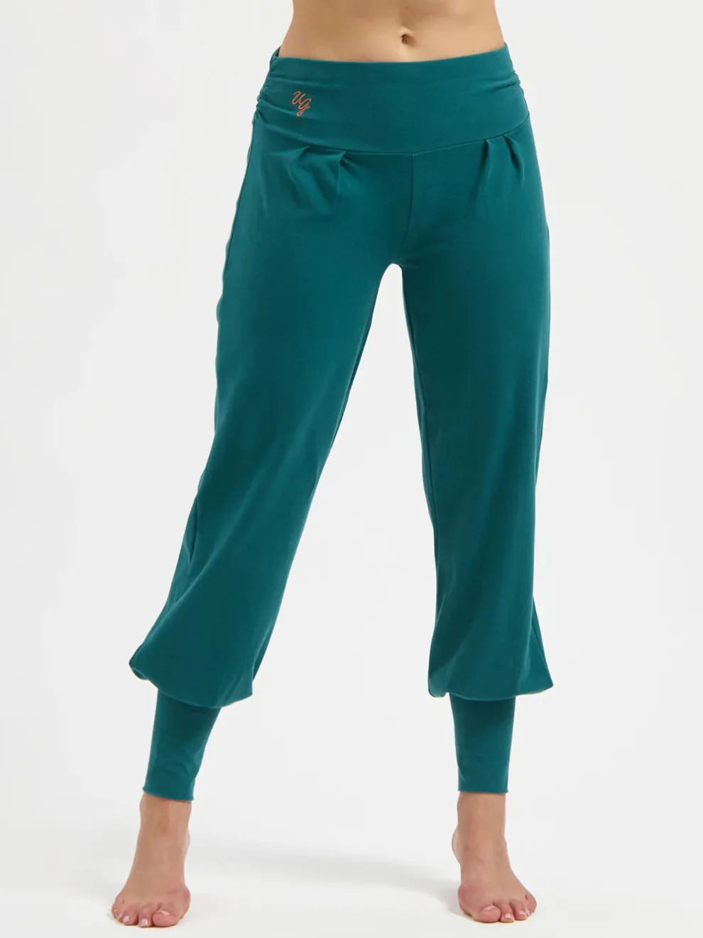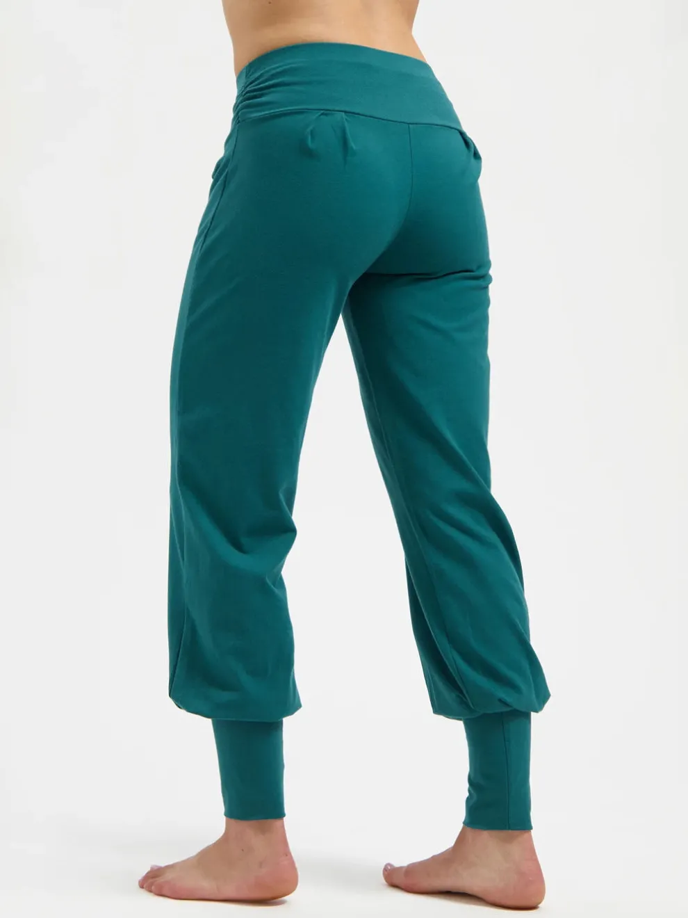 The Aladdin pants revisited, the pants feature a flat belt with shirring on both sides, offering support and elegance to the belly region. The legs of the Dakini pants are wider and then slim again at the ankles with cuffs, so even for your upside-down yoga poses, they will stay put.