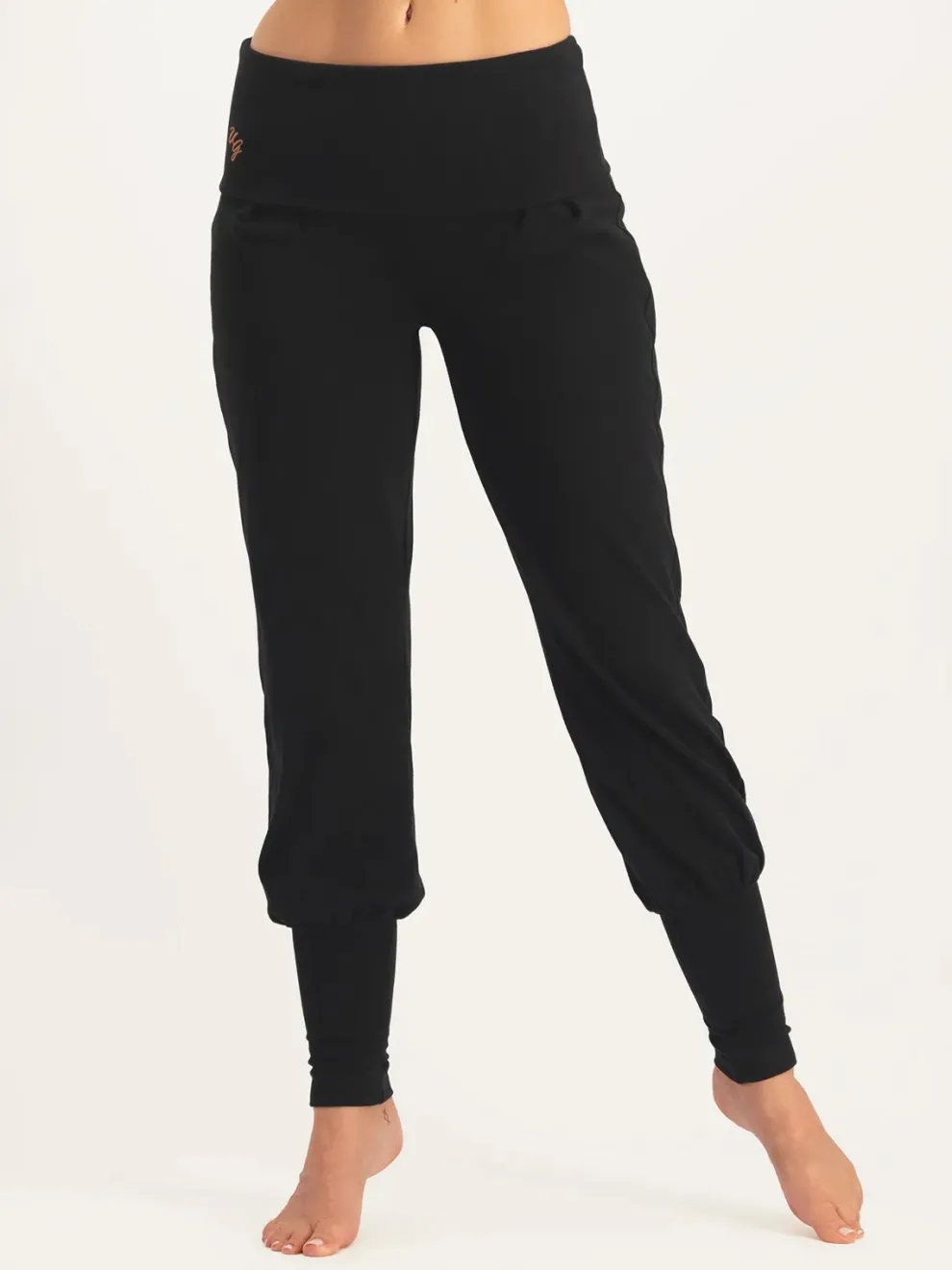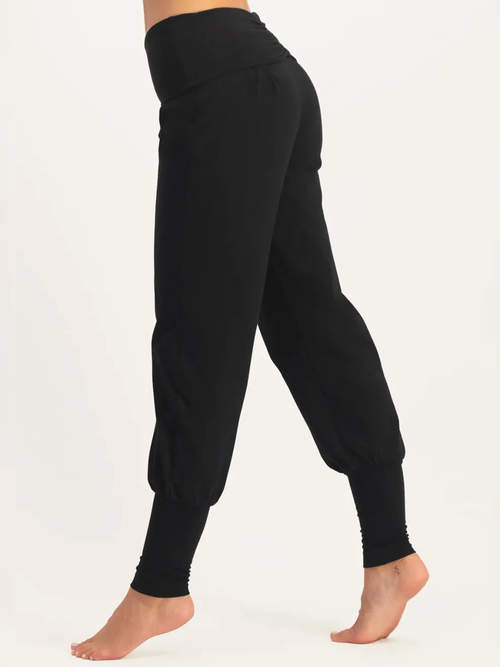 The Urban Goddess Devi loose yoga pants are made from soft organic cotton – perfect for slow-paced yoga classes or lounging at home. The double waistband adds warmth and comfort.
