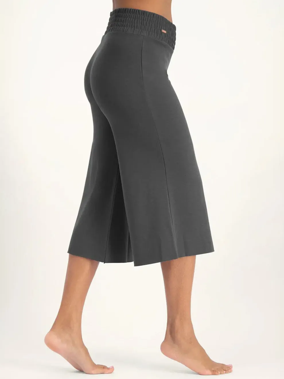 These capri pants are crafted from a premium blend of 48% lyocell, 48% organic cotton, and 4% elastane. They offer the perfect combination of stretch, softness, and breathability. The smocked waistband ensures a comfortable fit that stays in place and with their shorter length and wide legs, these capris are ideal for gentle yoga styles like yin, hatha, restorative, and meditation.