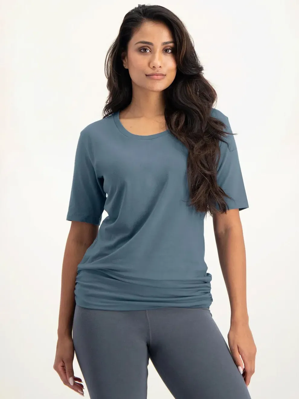 Enhance your yoga practice with the Urban Goddess Kami yoga t-shirt. Made from a blend of sustainable bamboo and certified organic cotton, this comfortable shirt stays in place during even the most intense and dynamic yoga & Pilates sessions. Naturally antibacterial and moisture-wicking, it’s perfect for all your yoga classes.