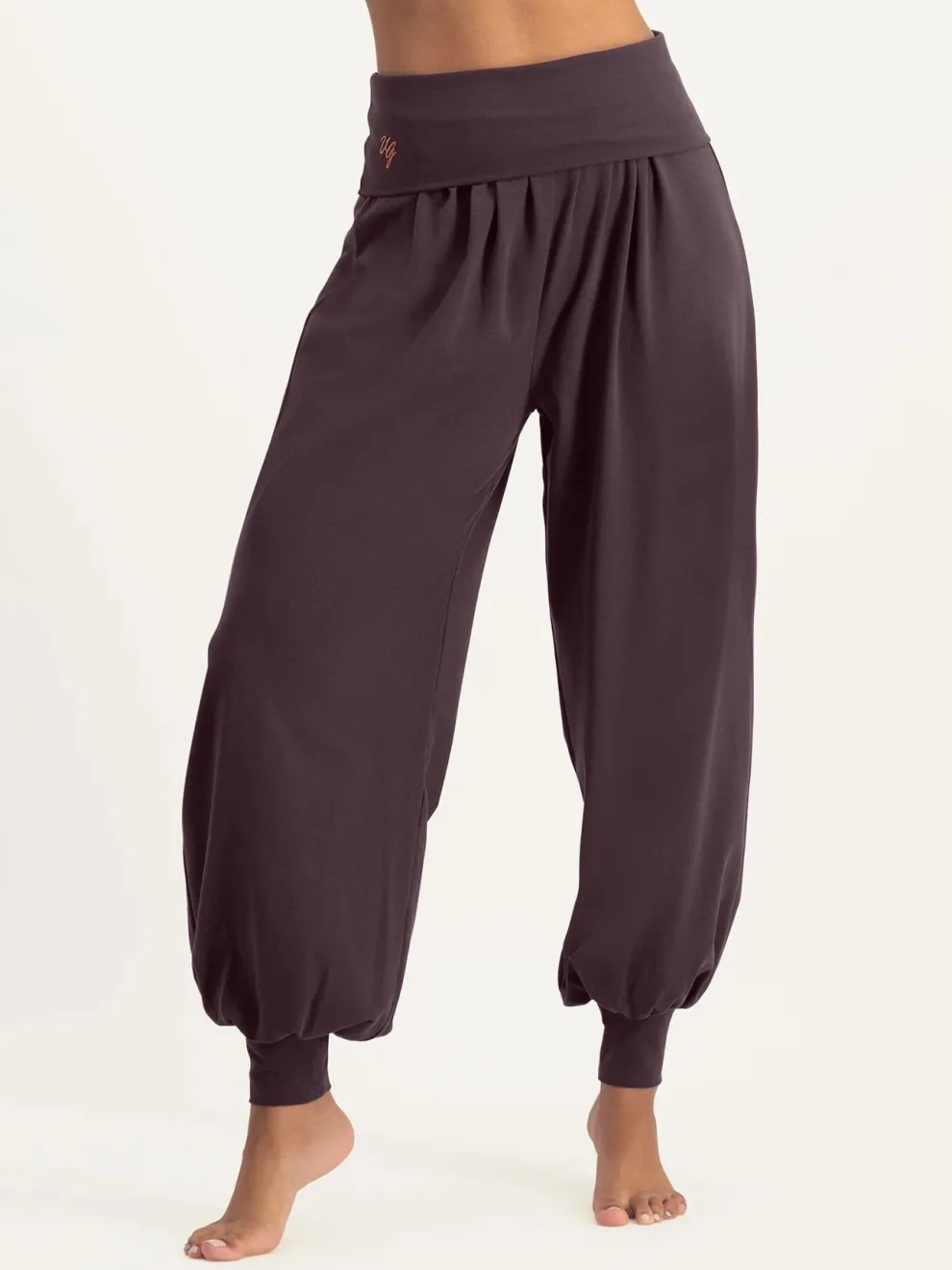 The Rhea yoga pants are stylish yoga pants with a loose fit. The women’s yoga pants have a fine wrap-around waistband and ankle cuffs that keep the pants in place. The soft wrap waistband allows you to style the trousers the way you like: high-or low-waist, whatever you like best!