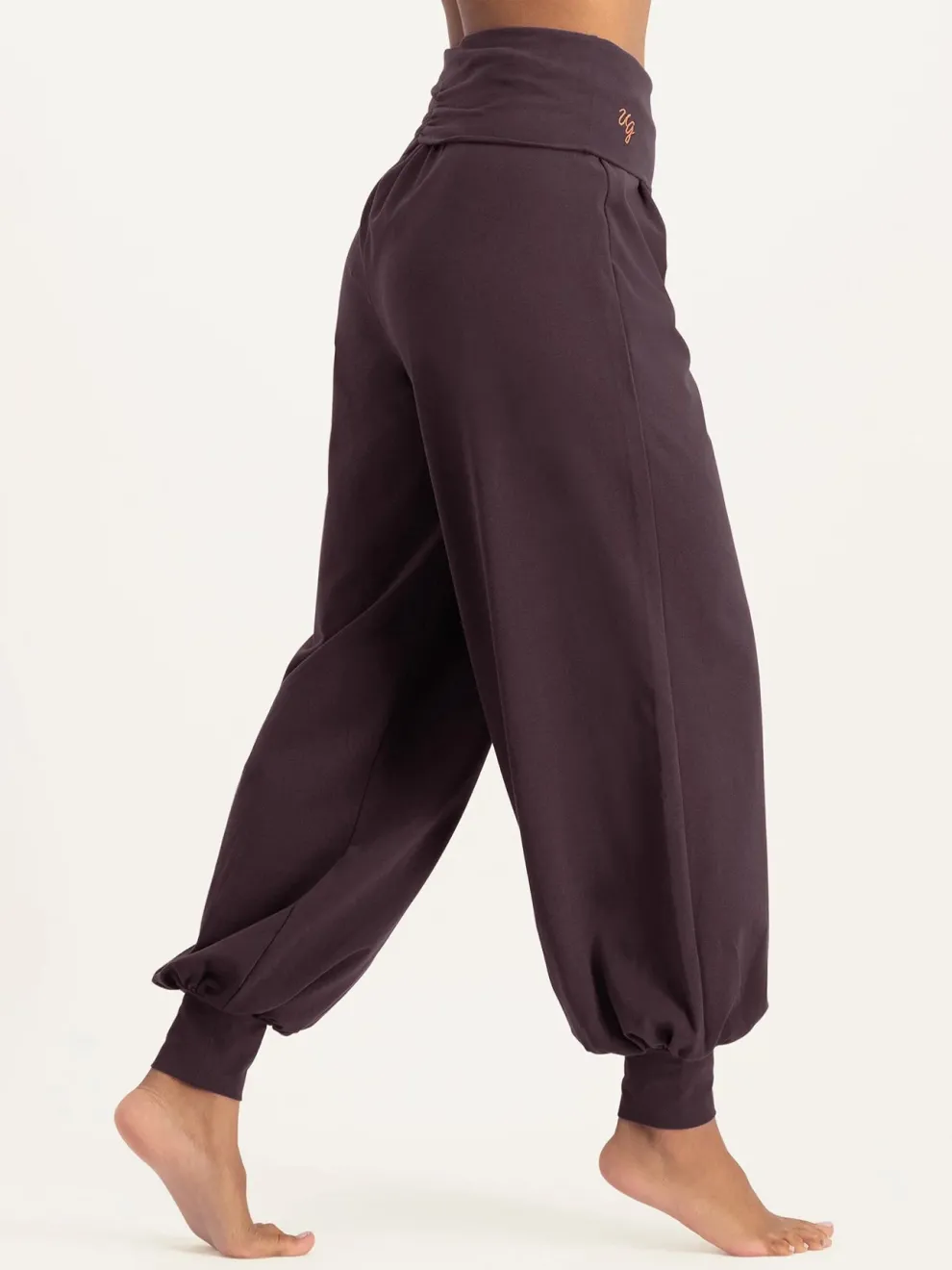 These wide yoga pants are made of Urban Goddess’ signature brushed fabric with 92% certified organic cotton. This makes the fabric super-soft to the touch and less likely to heat up during your practice. The addition of lycra also makes for a stretchy fabric that moves with you in every asana.