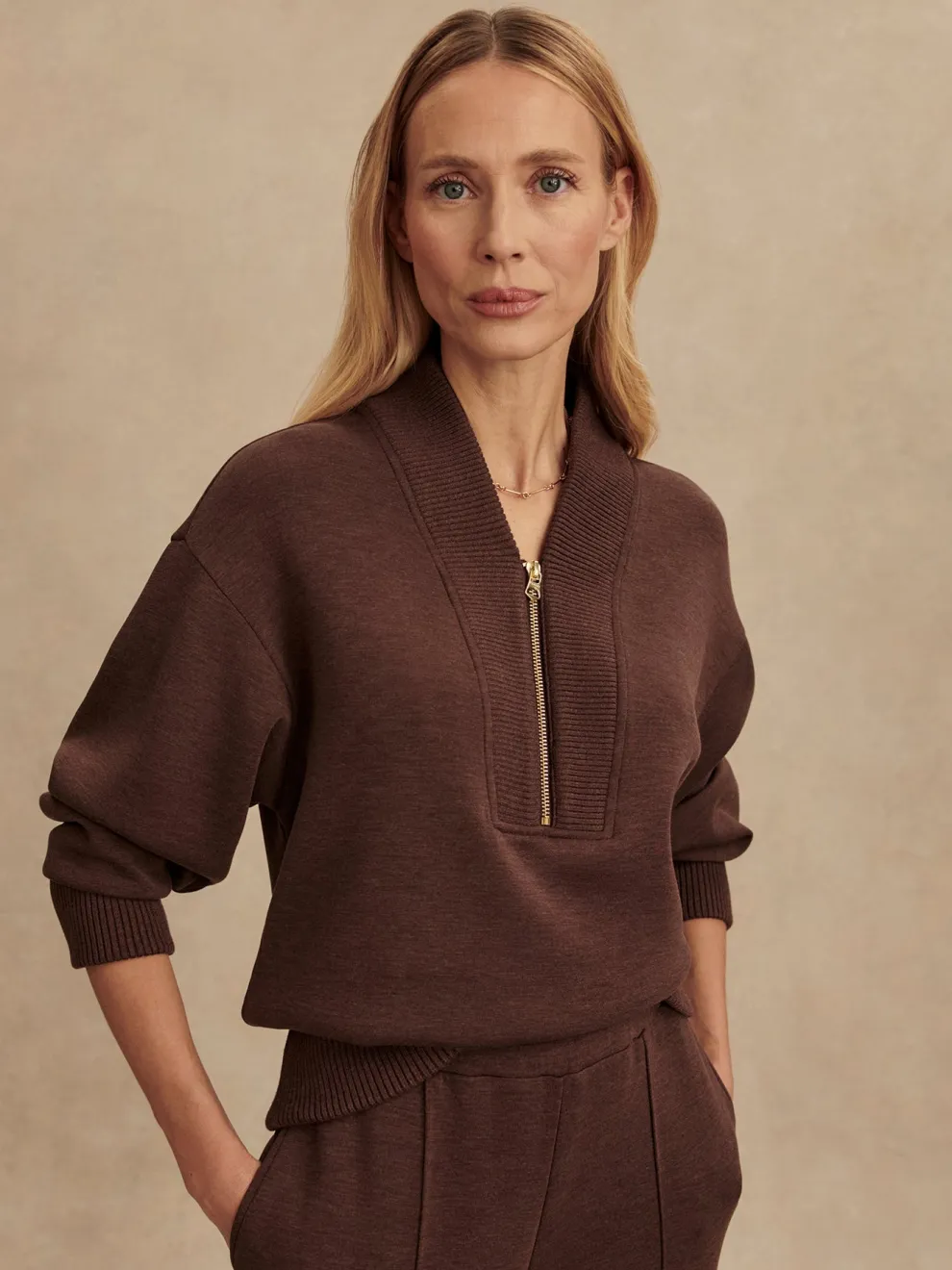 A new take on Varley’s bestselling Davidson sweat, the Sally features a V-neckline panel with a chunky rib knit.