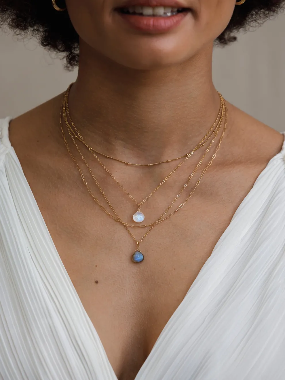 A faceted iridescent labradorite gemstone in Wanderlust’s signature shape floats delicately on a fine gold chain.