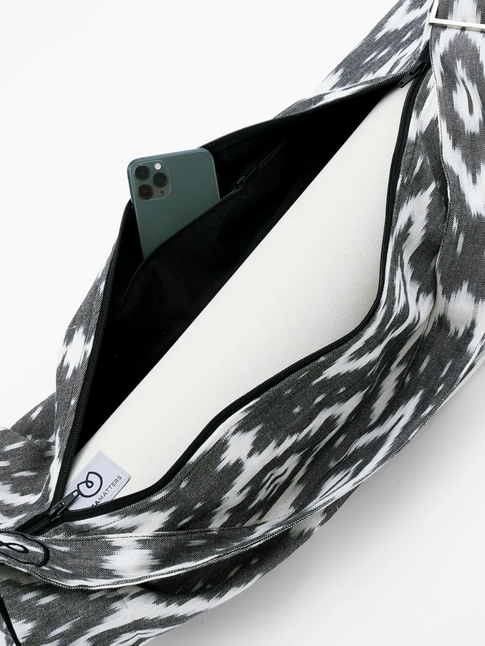 Our bestselling, Zip Up Yoga Bag,madein our favourite Ikat fabric. Ikat weaving has a rich heritage, dating back thousands of years as a traditional textile used in South East Asia and South America. It is with gratitude that we can still enjoy the beauty of this meticulously detailed design process today.
