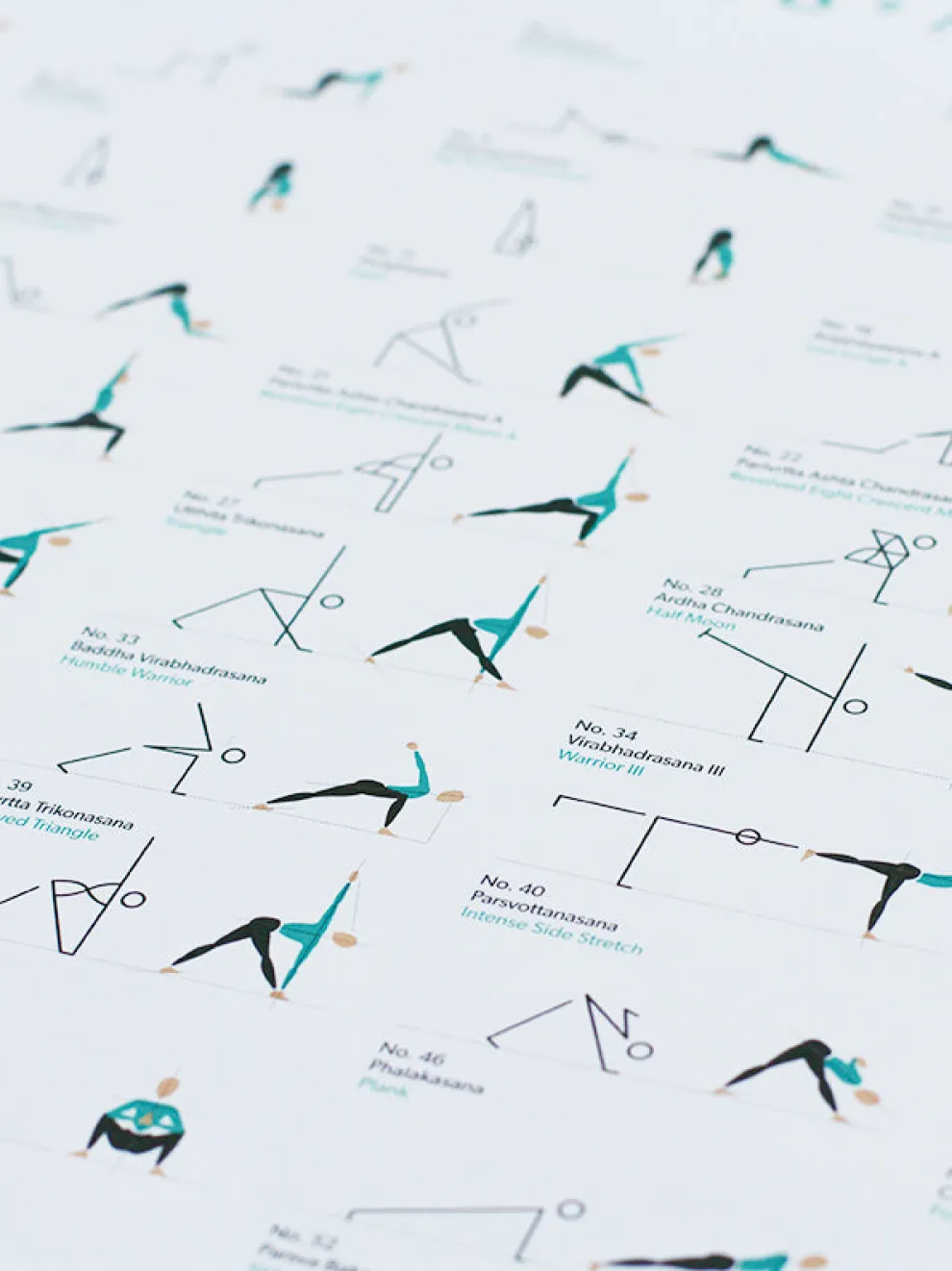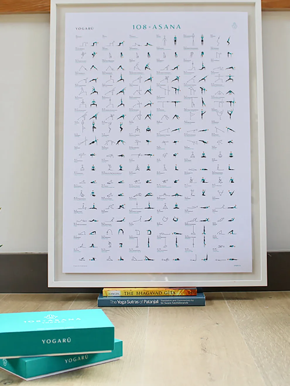 The 108 Asana poster is designed as a sequencing guide to help you to step on your mat with ease and flow. The poster features all 108 signature Yogaru illustrations, each with accompanying line versions to help you sketch down your sequences. Each illustration has the Sanskrit/English asana names and are numbered to synchronise with the Designed and illustrated by a certified yoga teacher.