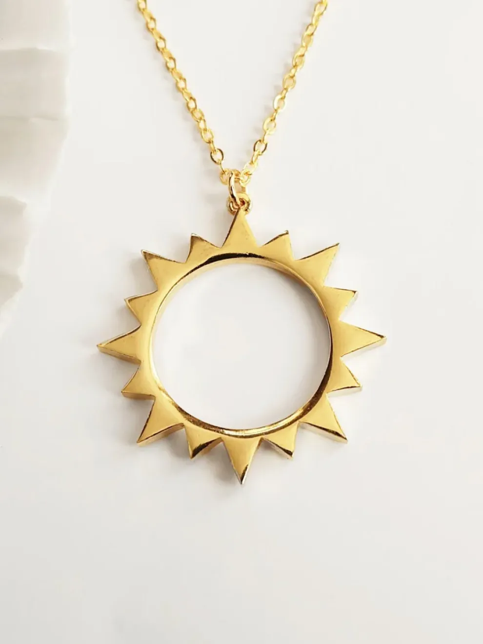 Channel the radiant energy of Aelia, the Sun Goddess, with this abstract sun necklace. Its minimalist design adds a subtle glow to any look, making it a thoughtful gift or a timeless piece for your own collection.