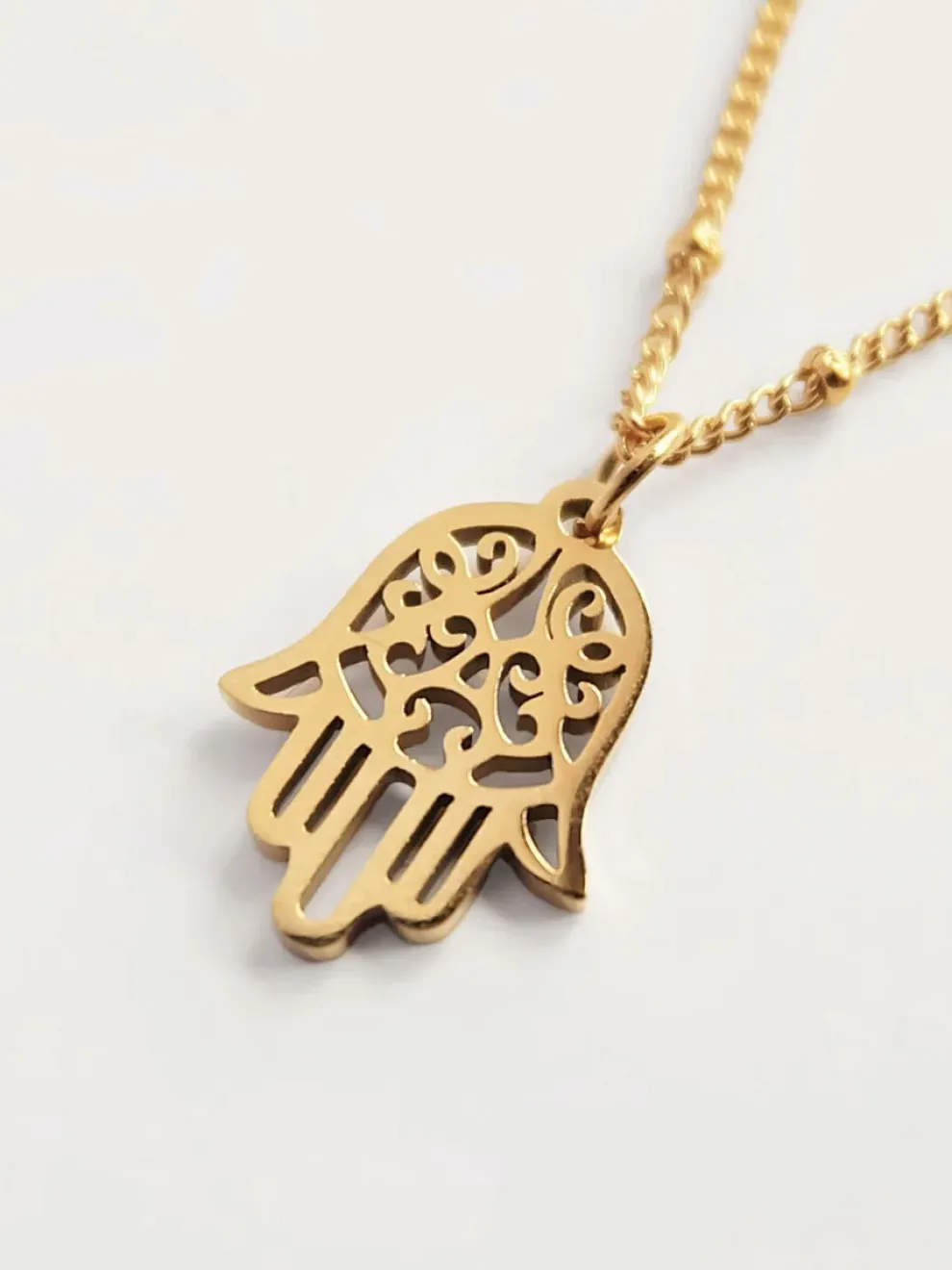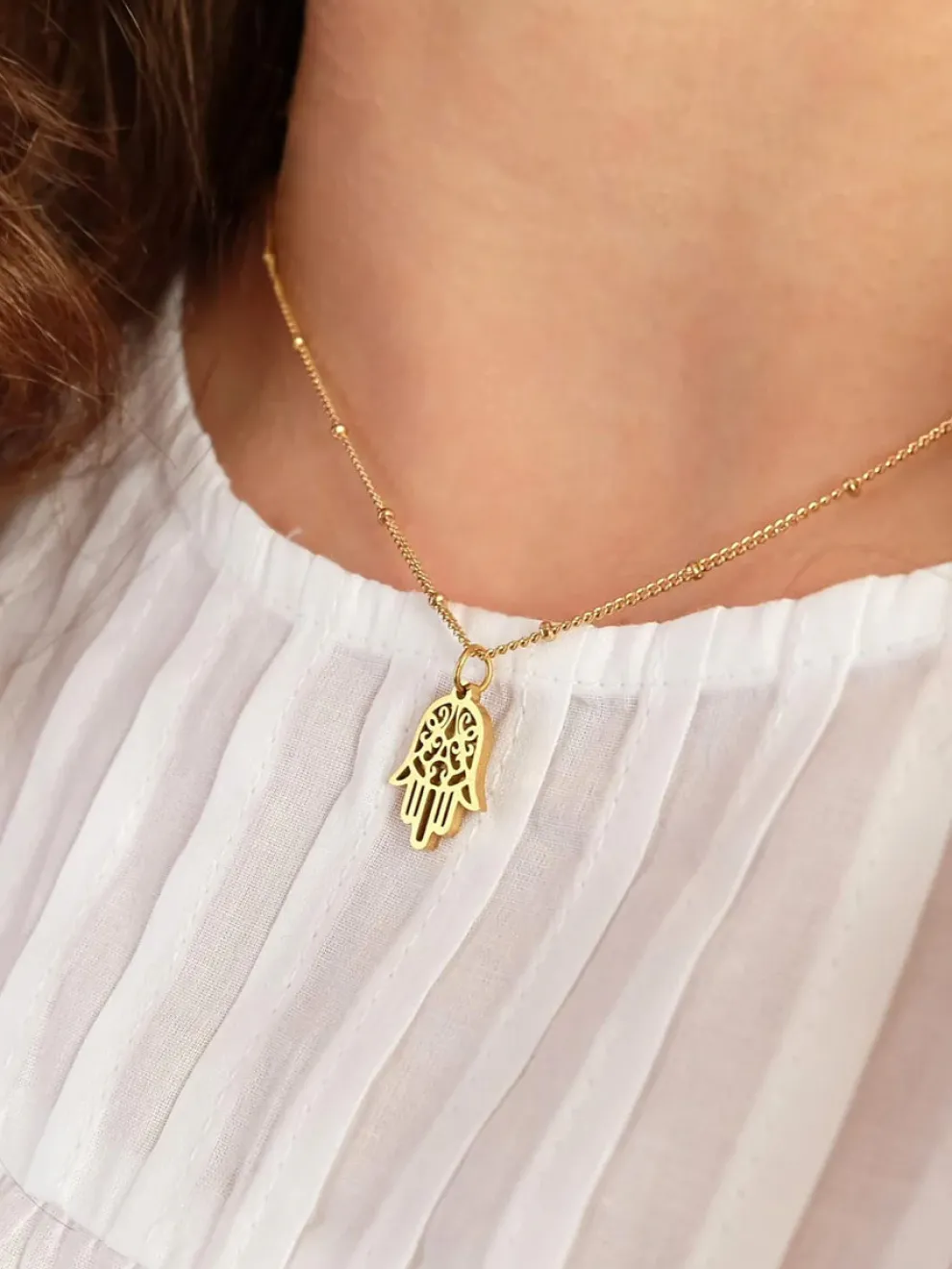 A dainty hamsa charm on a gorgeous satellite chain. Perfect to add some interest to your necklace layers or on its own as a subtle statement piece. This necklace is lightweight and easy to wear. The hamsa is said to protect against the evil eye and bring good luck across cultures.