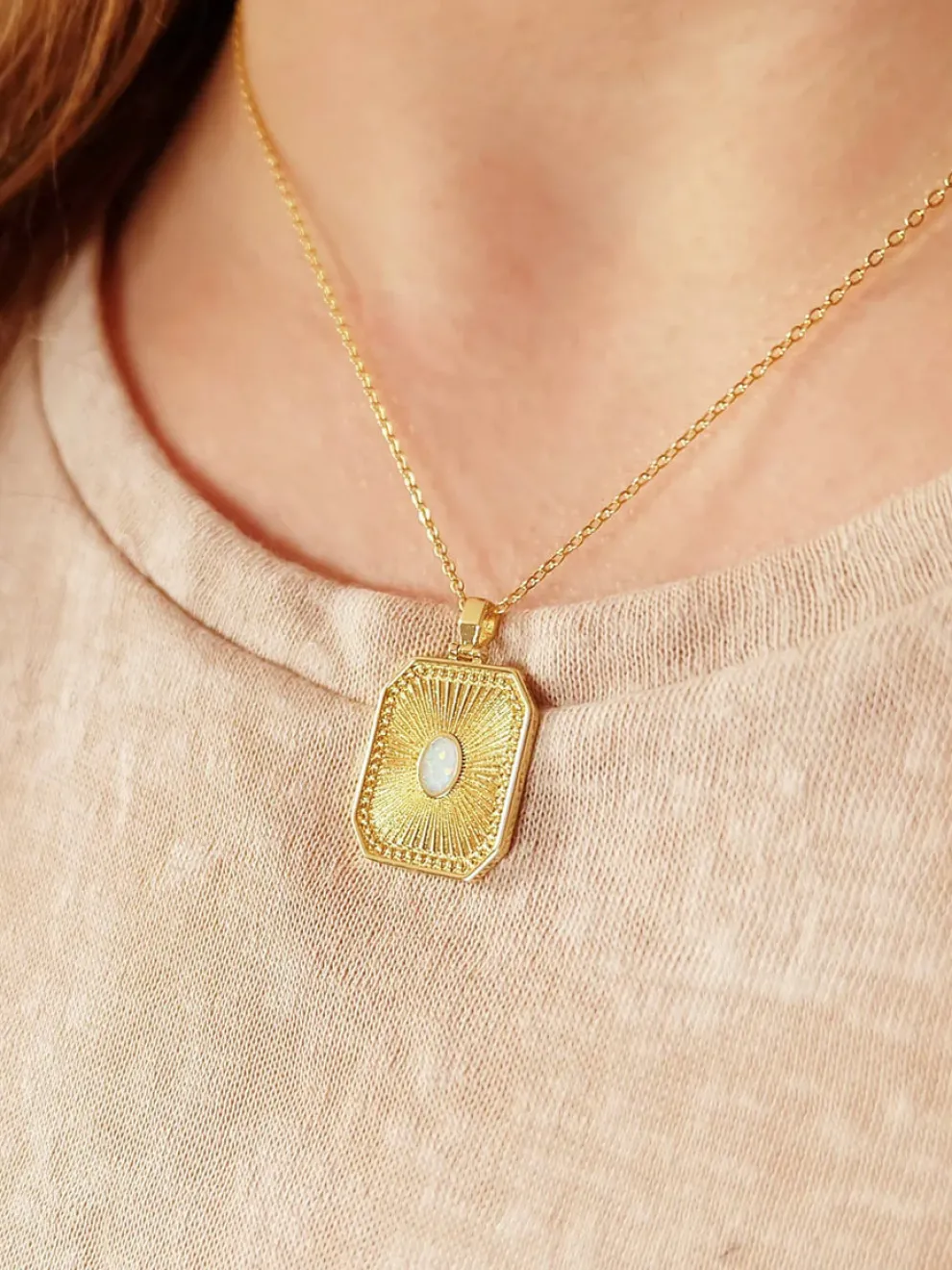 A radiant gold sunburst pendant, beautifully set with a white opal that shimmers with every movement.