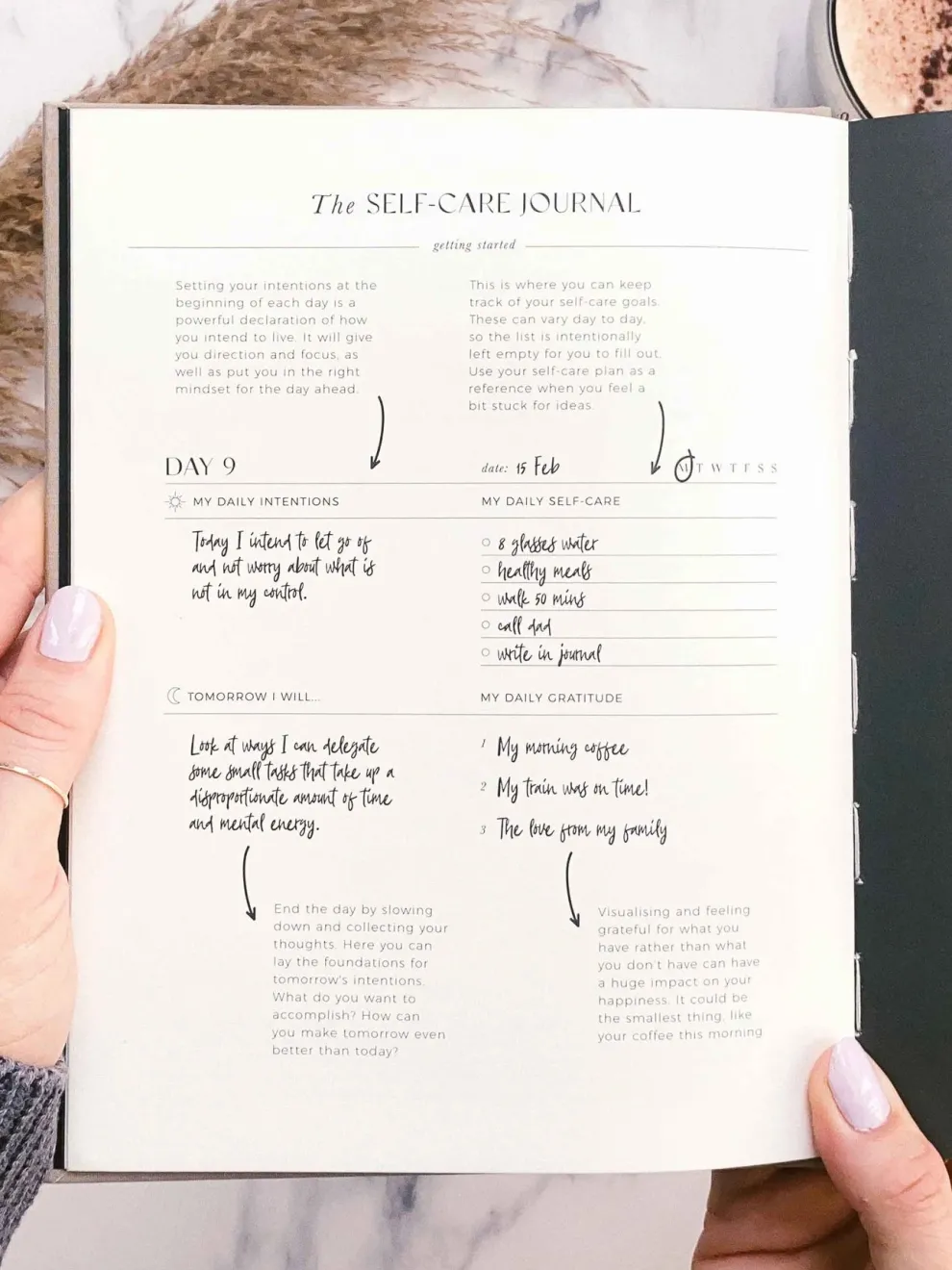 3. The plan:This is the main section of the journal, helping you toincorporate self-care into your daily routineand giving you a daily space to track your practice. It also includes spacefor writing down your daily intentions, gratitude and plan the next day.
