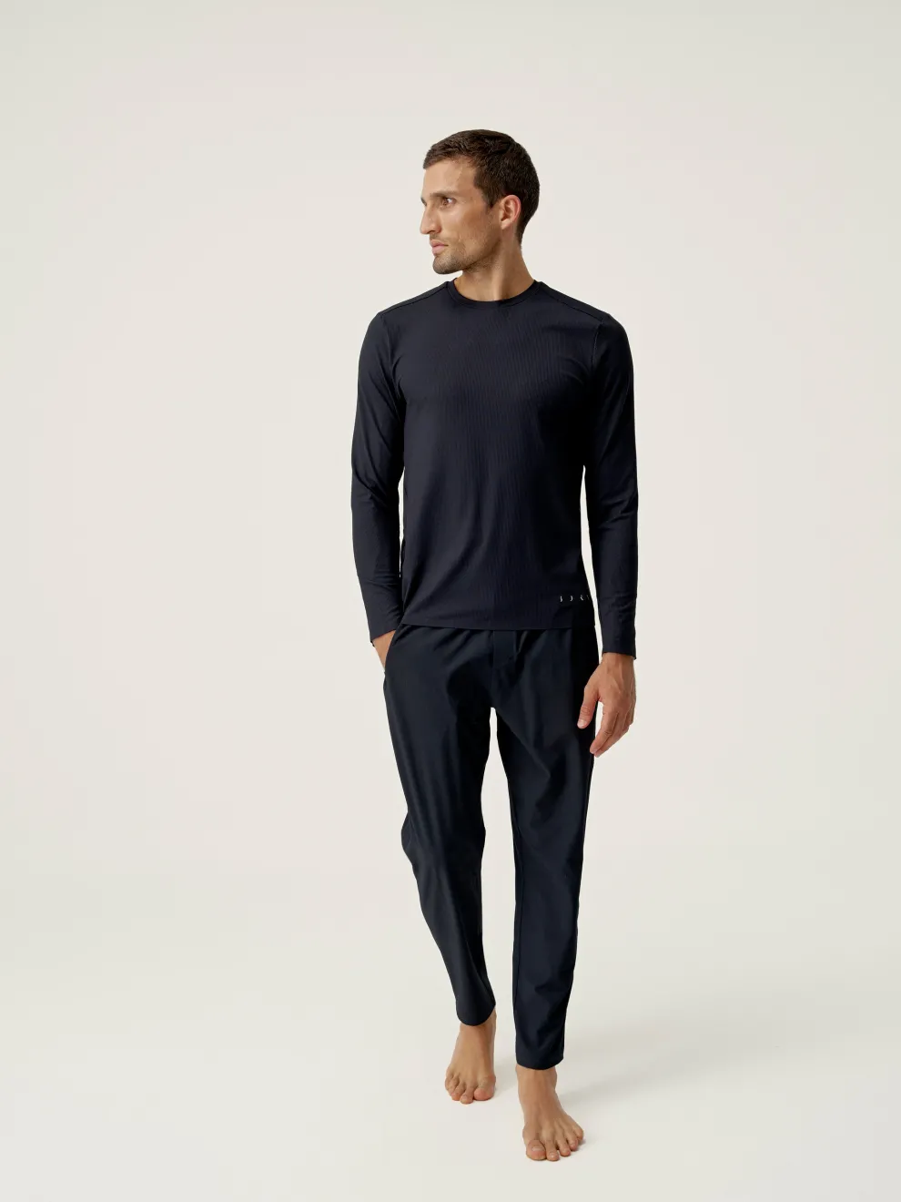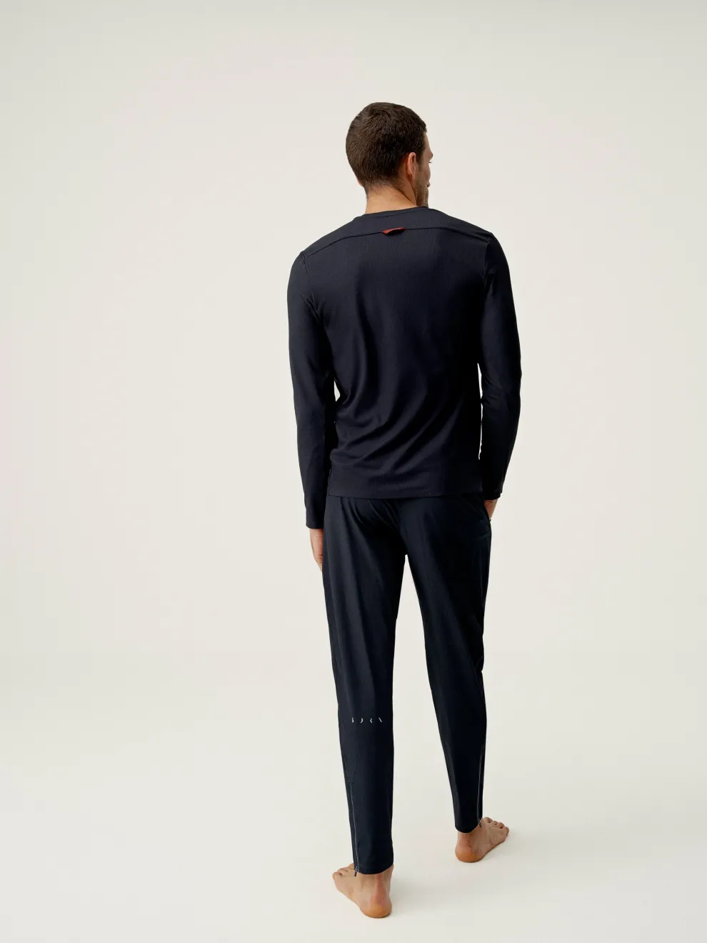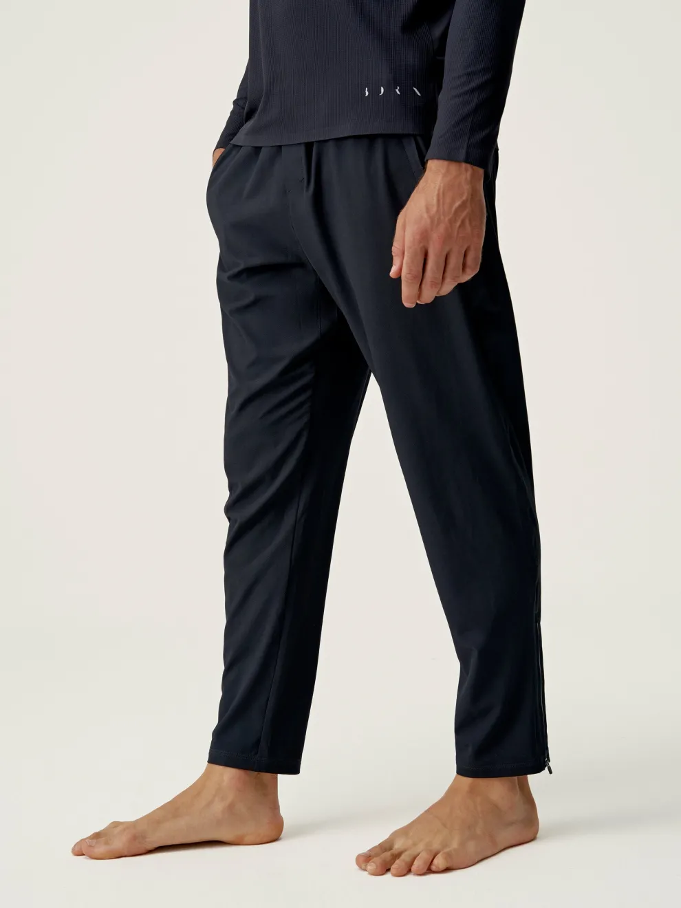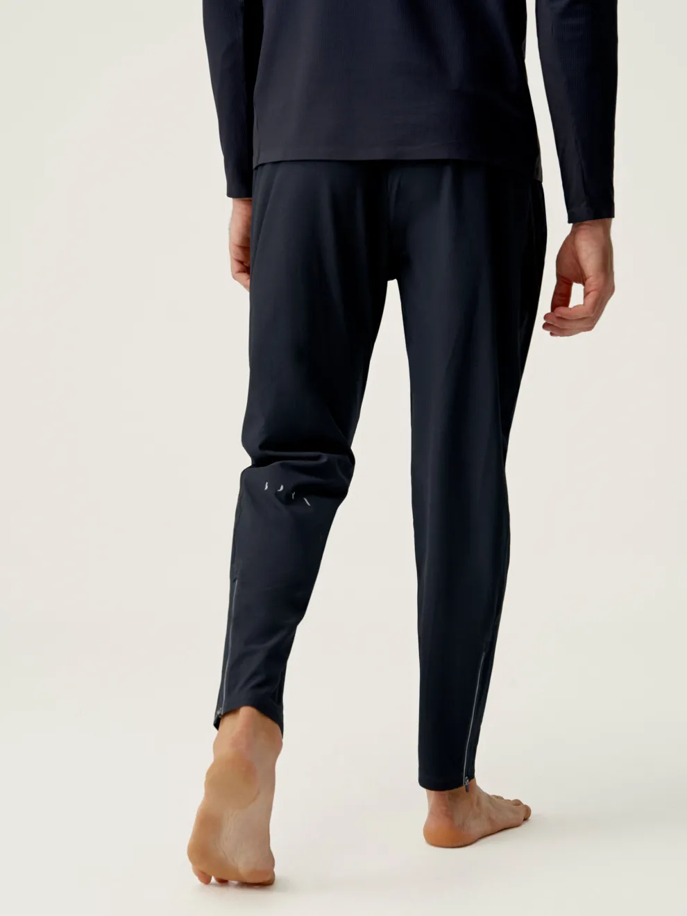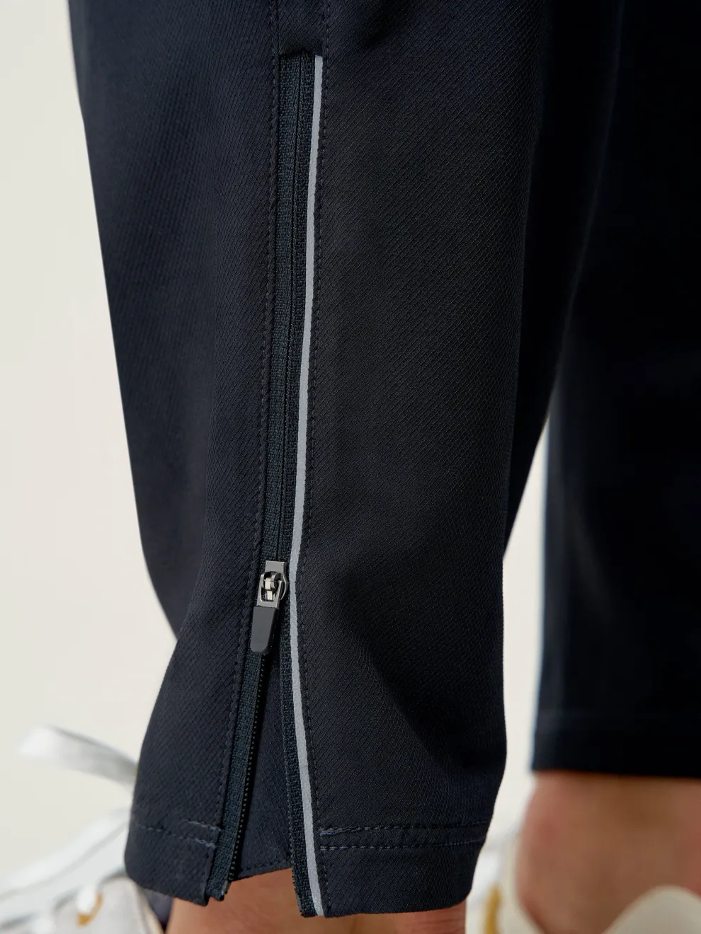 Joggers for sports and street-casual wear. Lightweight, stretchy and comfortable “Air_D” fabric, zipped side pockets, hidden pocket at back of waist. Zip at the base of each leg with reflective line.