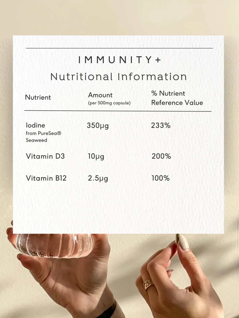 - PureSea Organic Hebridean Ascophyllum nodosum seaweed powder, Vitamin D3 (Lichen extract plus Tapioca), Vitamin B12 (Mushroom extract), Vegan capsules shell (hydroxypropyl methyl cellulose)