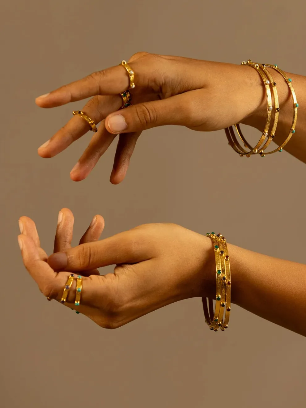 Goddess Charms’ iconic bangles are made for stacking, yet beautiful enough to be worn alone… we enjoy them both ways! Gently hand hammered to catch the light with studded semi-precious gemstones and dazzling 18ct Indian gold. Each stone activates a different Chakra, or energy point on the body.