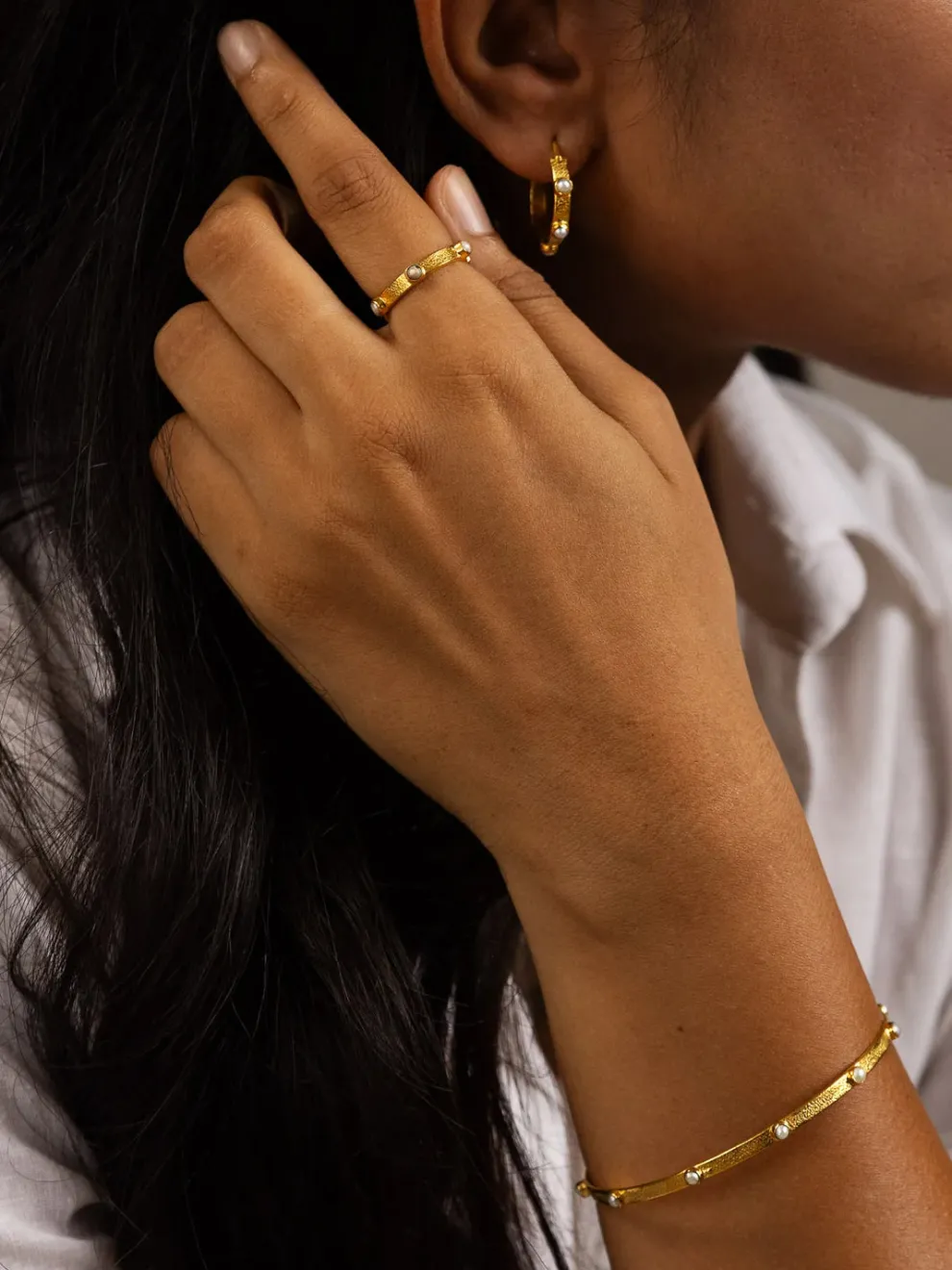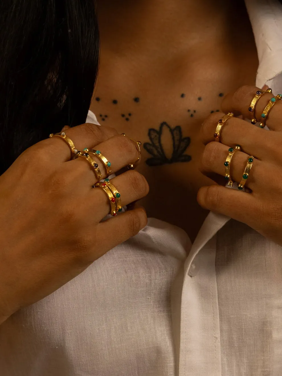 Create your own unique style with Goddess Charms’ fully adjustable, stackable rings. Hand hammered to catch the light with eye-catching semi-precious gemstones and dazzling 18ct gold.