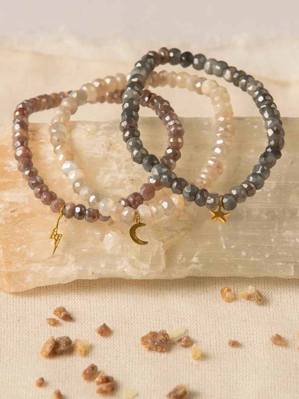 Believed to bring true love into the life of the wearer, Goddess Charms has carefully chosen three shades of these effervescent beads to signify the new, waxing and full moon phases. They are carefully finished with the sacred symbol of a lightning bolt to connect you to the expansive and inspiring energy of the night sky. They look beautiful both stacked together or worn alone.