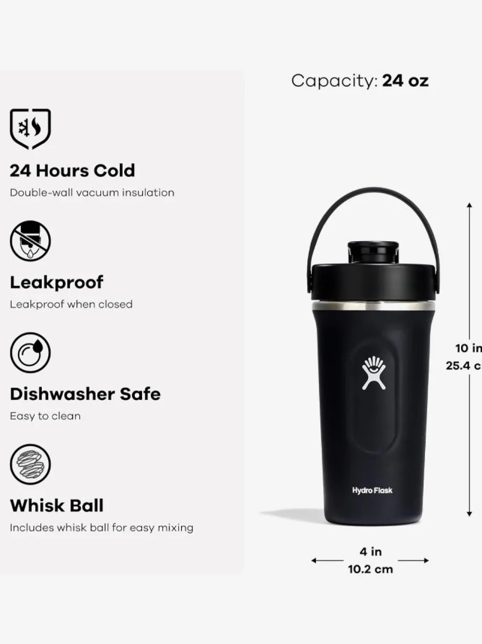 Shake up a perfect smoothie, protein or supplement shake. The Insulated Hydro Flask Shaker Bottle features an ergonomic design and a leakproof, flip-top chug spout. An internal whisk ball mixes it right every time and the insulated top keeps contents cold for up to 24 hours.
