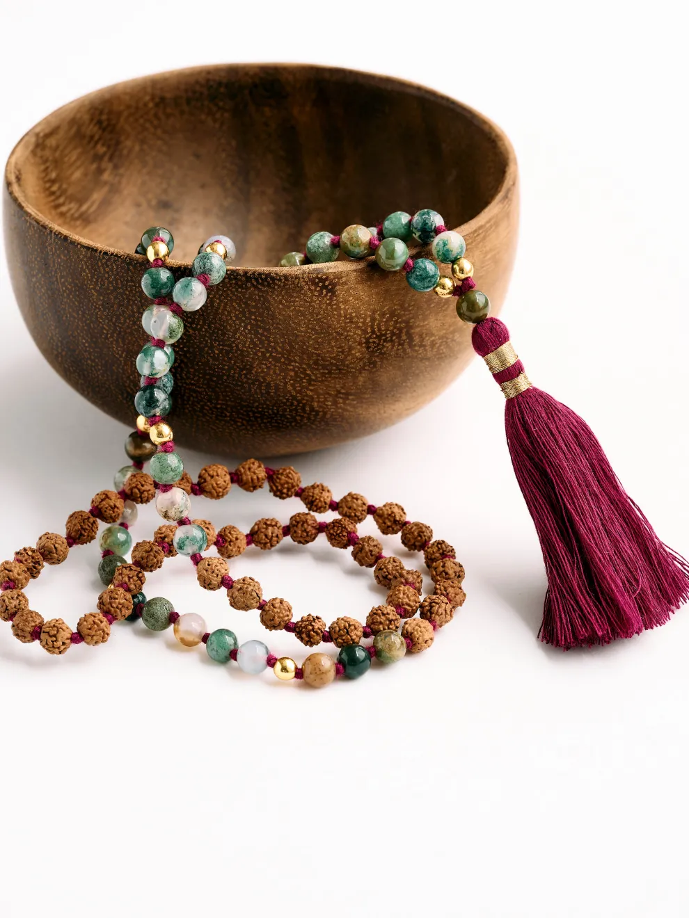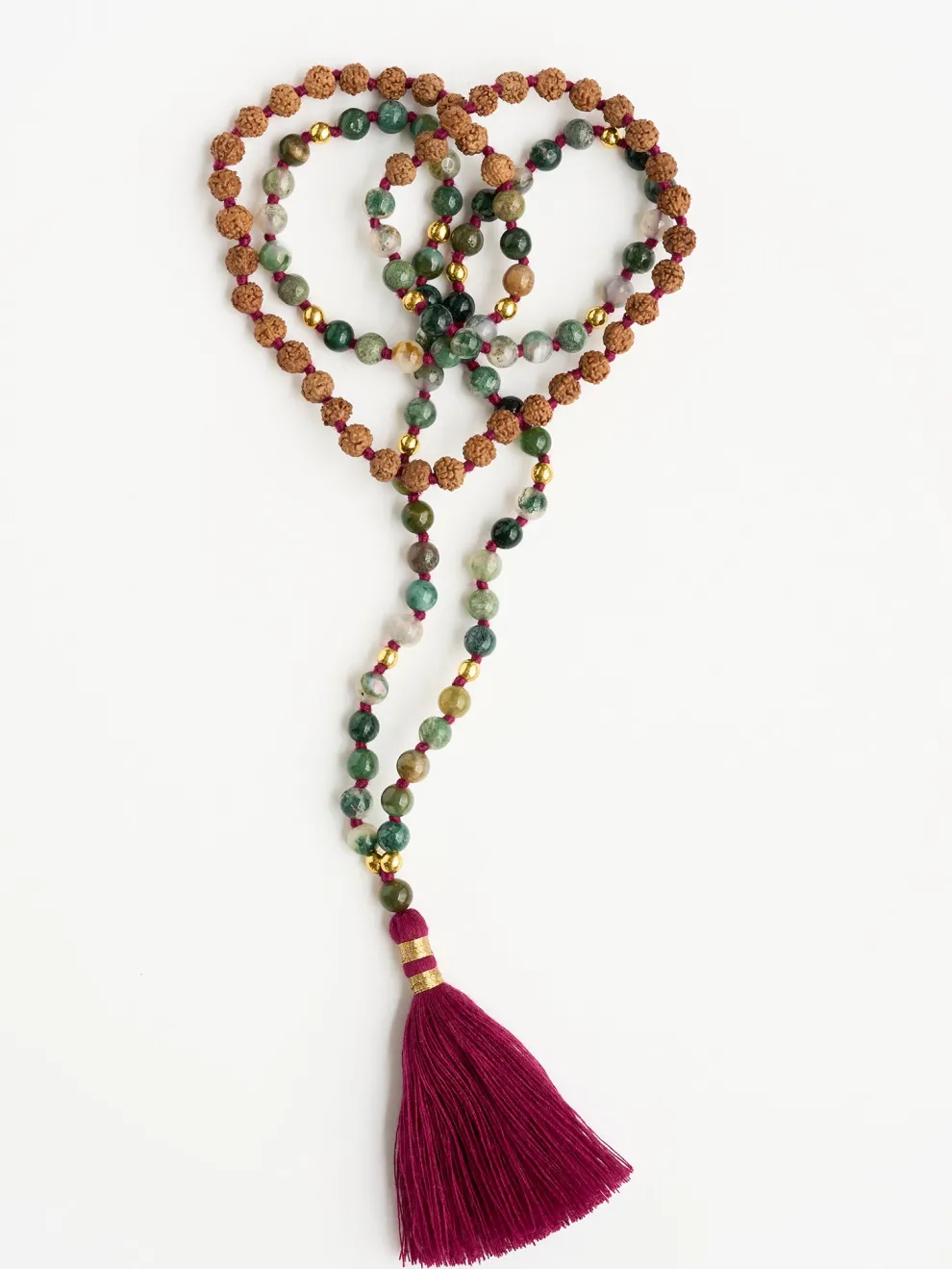 - Malas are hand-knotted between each bead while bracelets are hand-strung on elastic thread