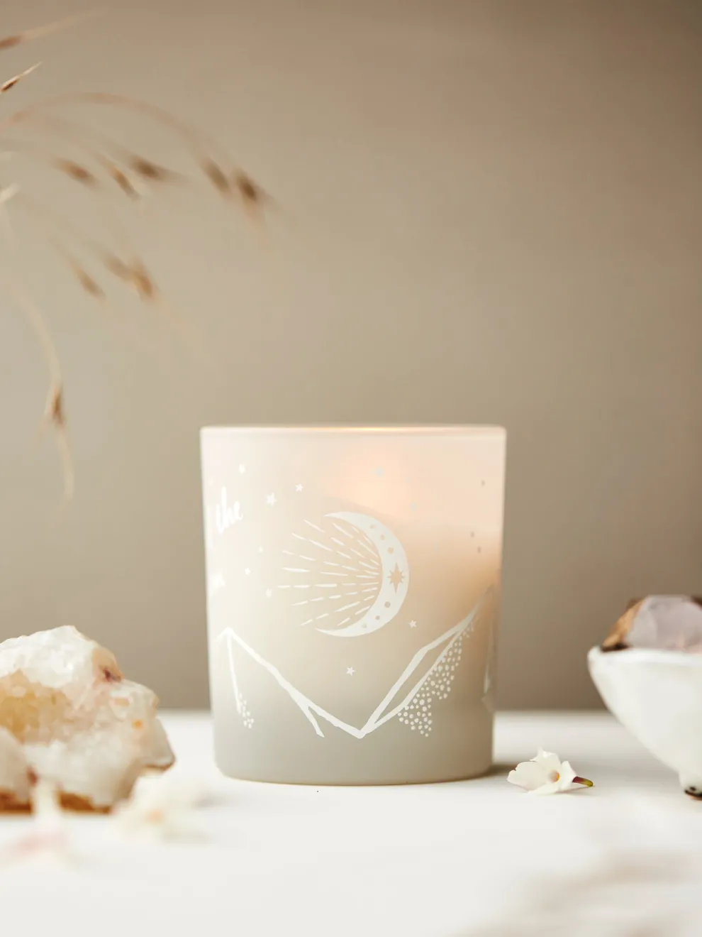 The Moon, stars and mountains are illustrated on the pale glassware, which illuminates when lit, creating beautiful shadows around the room.