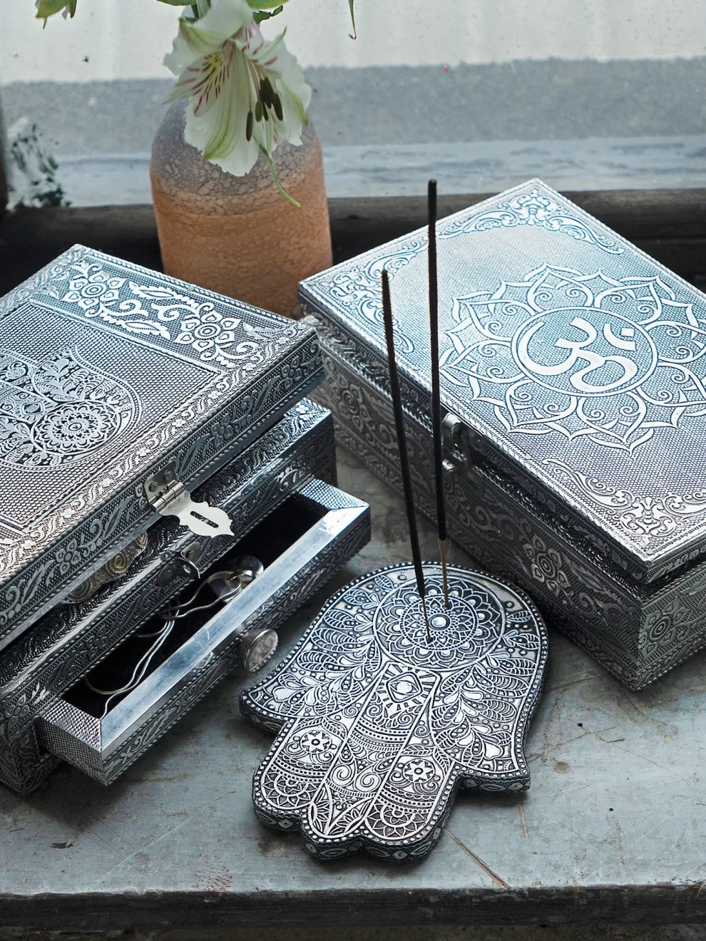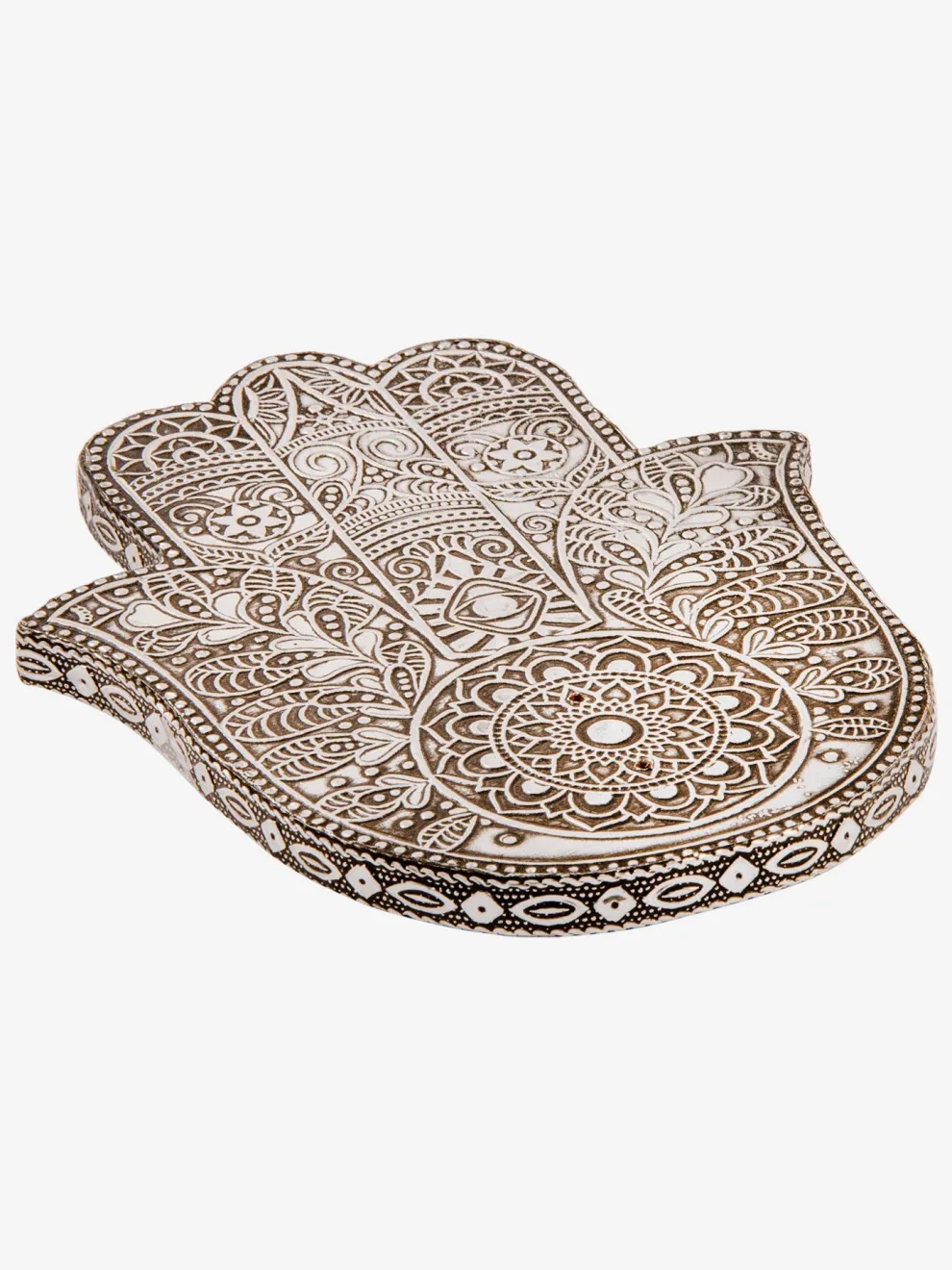 An attractive wooden crafted Hamsa hand incense holder, beautifully finished in embossed foiled aluminium wrap.