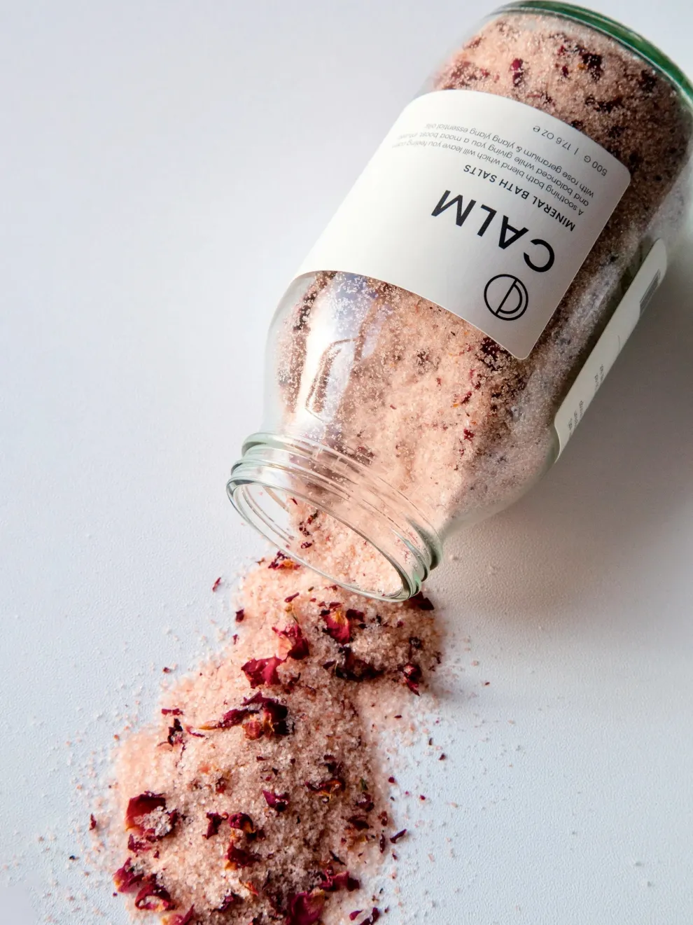 - Magnesium sulfate (Epsom salt), sodium chloride (Himalayan salt), maris sal (Dead Sea salt), pelargonium graveolens (rose geranium) oil, cananga odorata (ylang ylang) oil, rose petals.