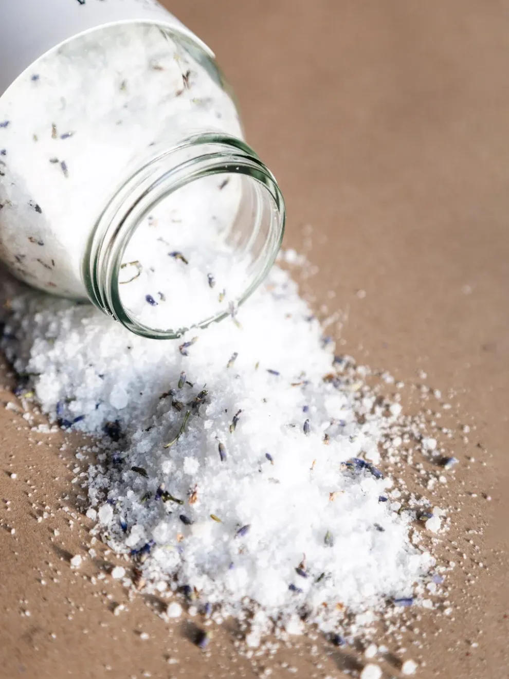 - Magnesium sulfate (Epsom salt), maris sal (Dead Sea salt), lavandula angustifolia (lavender) oil, boswellia carteri (frankincense) oil, lavender buds.