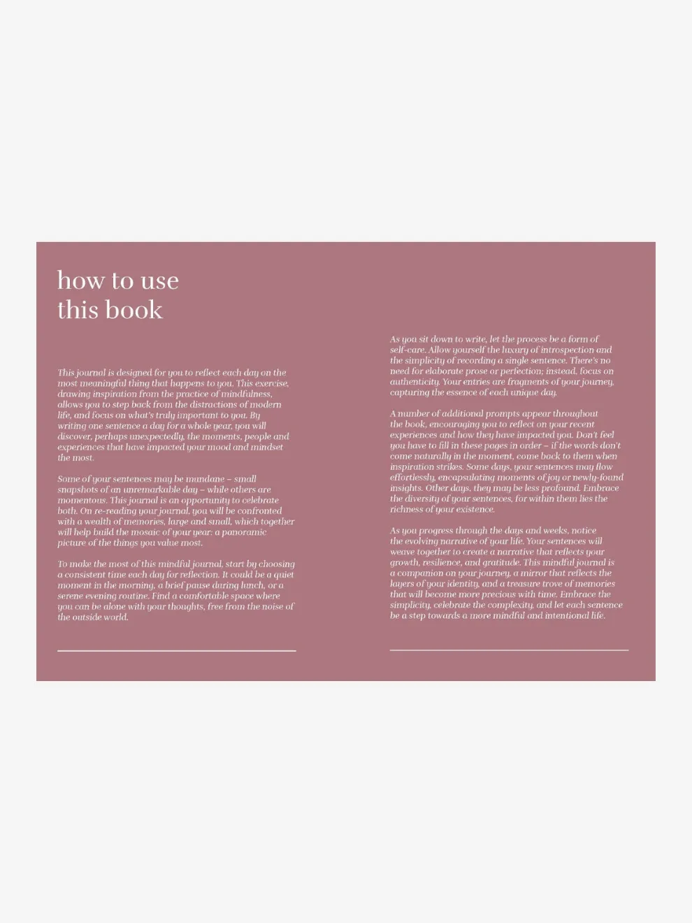 Whether you journal in the morning or evening, it will only take a couple of minutes to capture each day. Finding the most meaningful moment of each day and jotting it down; whether it’s a conversation, a lyric, a line from a book or even an image, will help you build a bank full of memories which you can rediscover for years to come.One Sentence a Daywill help you to relive these forgotten memories and give you an instant pick me-up and to help you appreciate the significance of everyday moments of happiness.