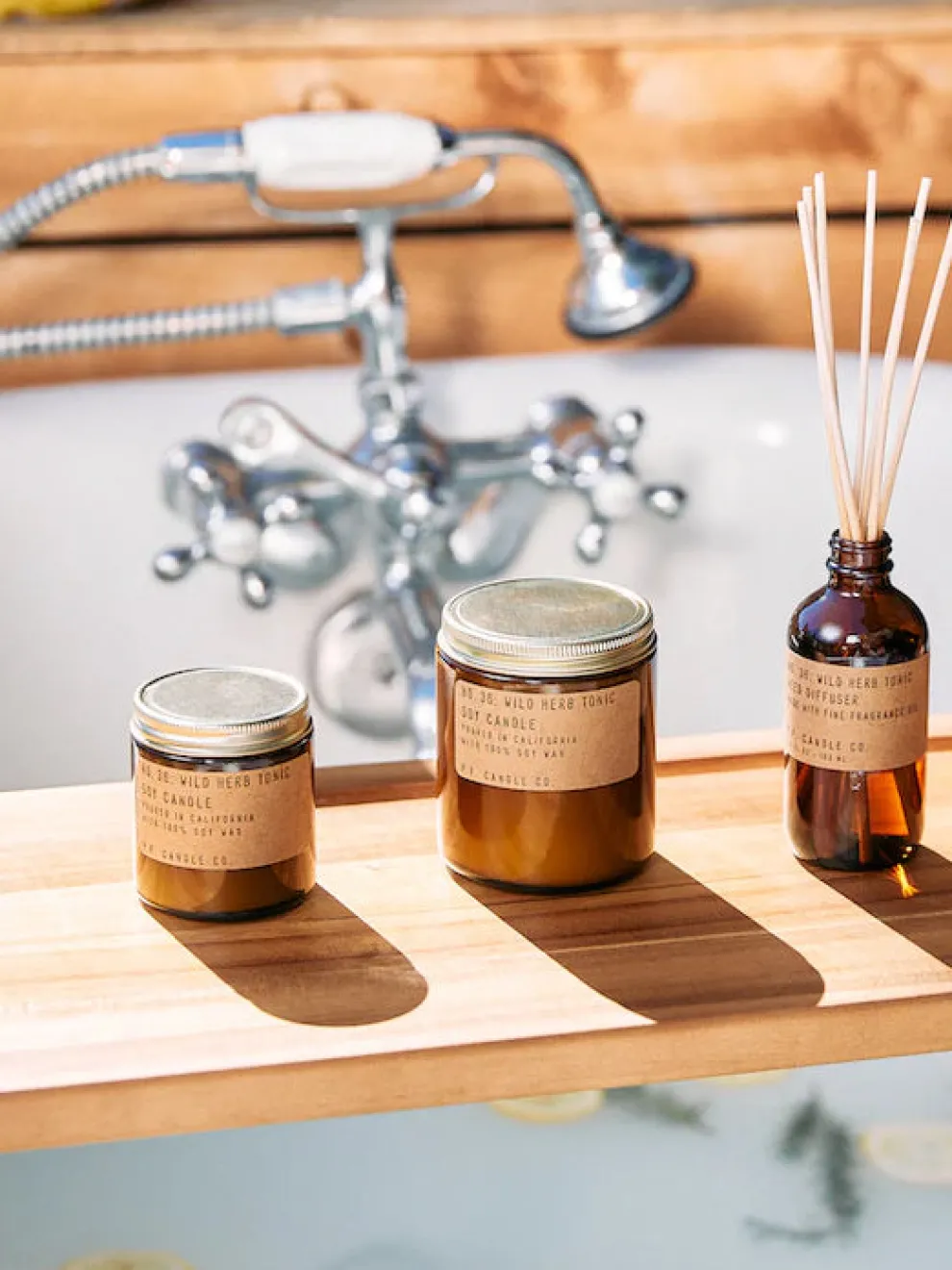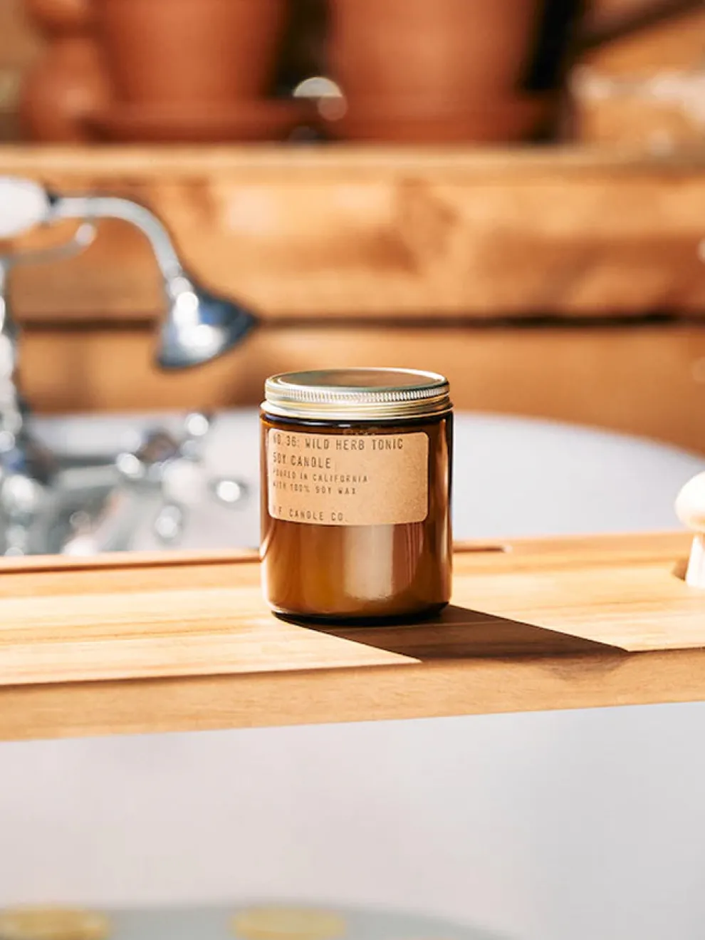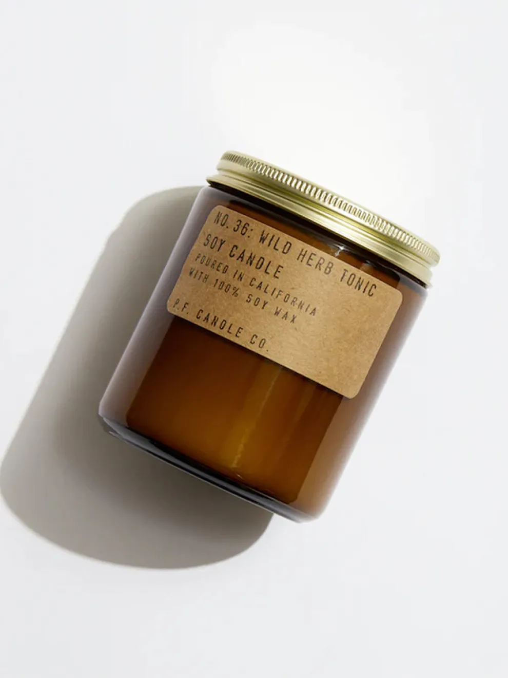 P.F’s7.2 oz Standard Candles are hand-poured into apothecary inspired amber jars withtheir signature kraft label and a brass lid. This istheir most popular size and is meant for dressers, countertops, nightstands – basically everywhere.
