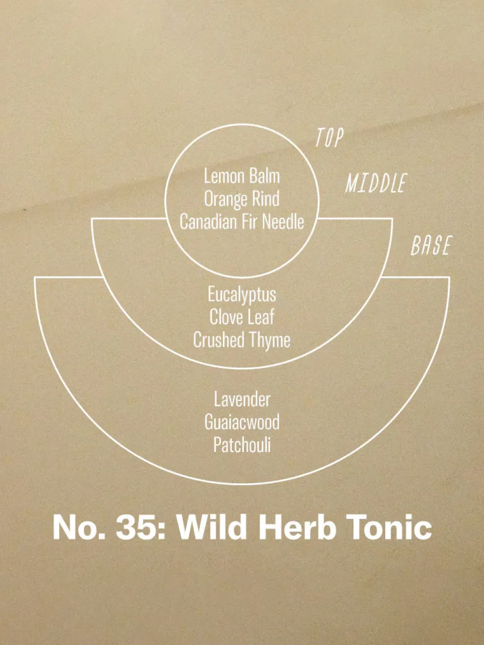 Barefoot walks through wild herb gardens, cool mountain stream baths, crisp morning air. Aromatic, camphorous, earthy. Lemon balm, crushed thyme, orange rind, and fir.