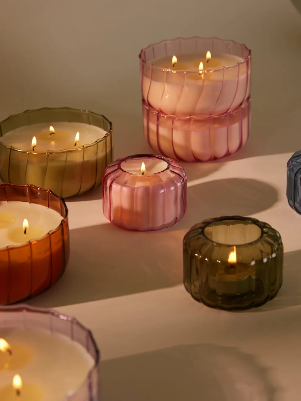 This Paddywax Ripple Glass Candle adds an elegant focal point to any space. Its stylish ripple-designed glass vessel brings a subtle yet sophisticated accent to any occasion.