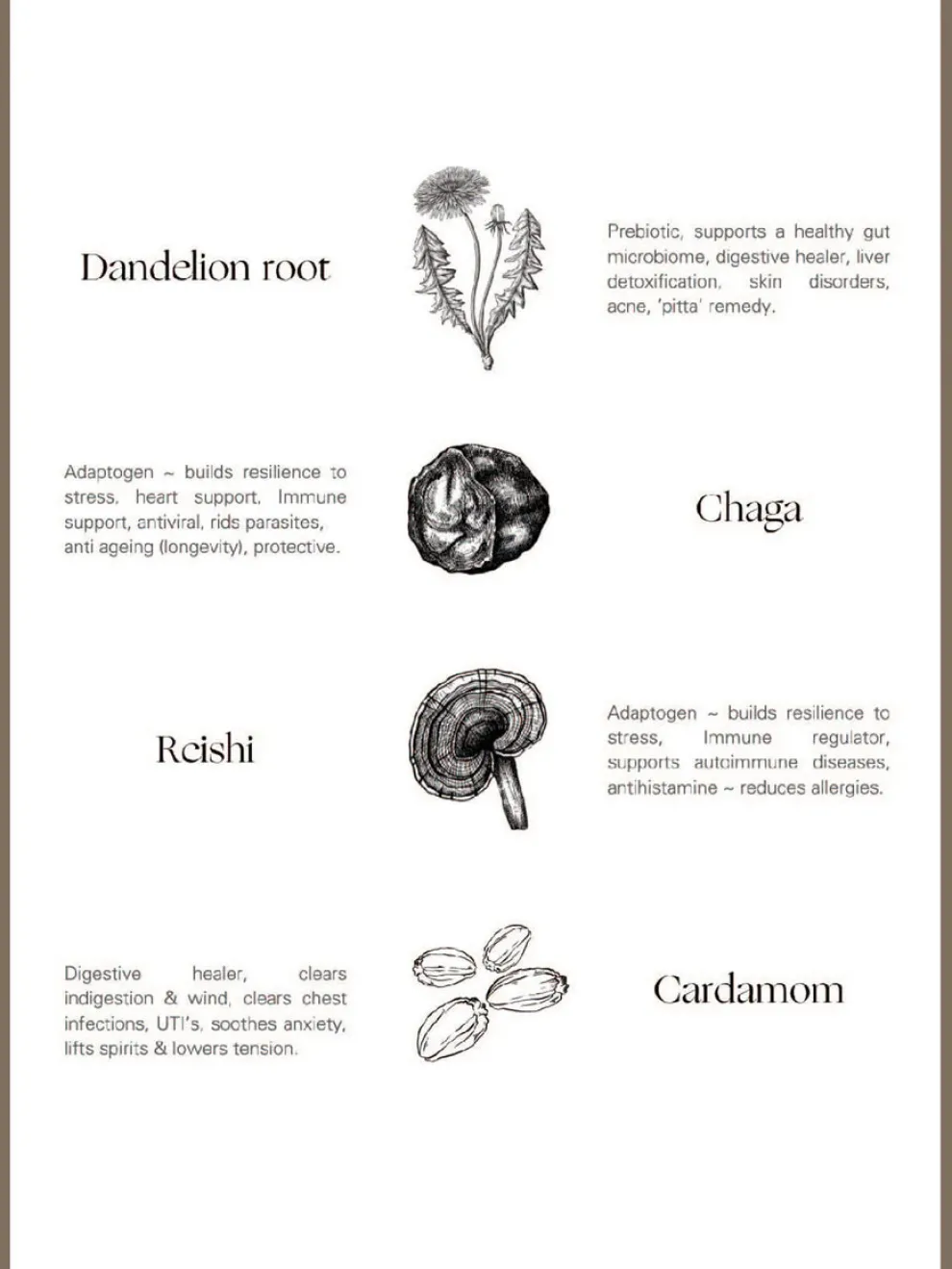 - Taraxacum Officinale ~ (Roasted Dandelion Root), Inonotus Obliquus ~ (Wild Canadian Chaga), Ganoderma Lingzhi ~ (Reishi), Elettaria Cardamomum ~ (Cardamom)