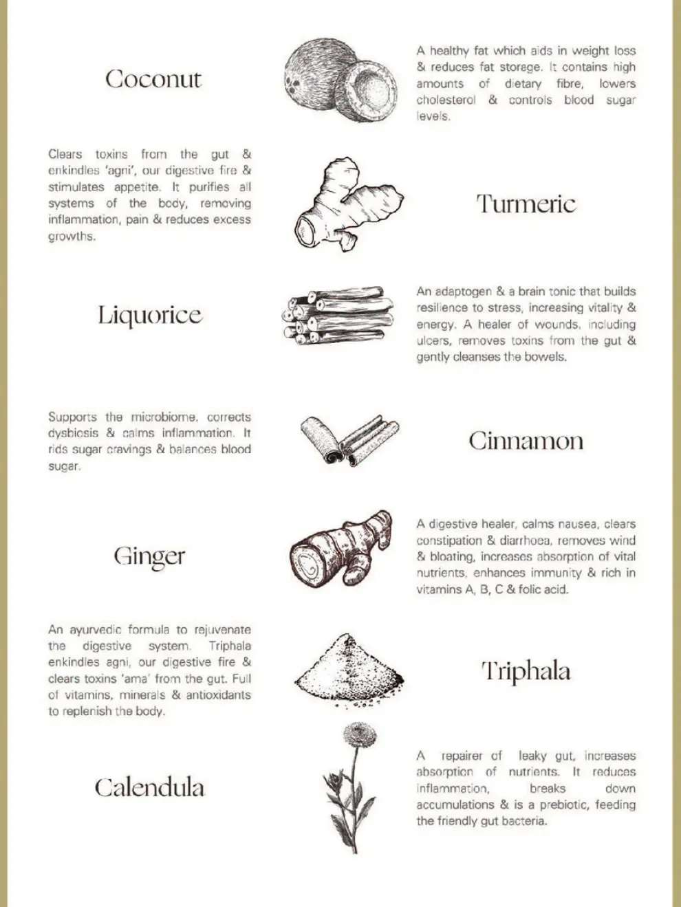 - Cocos Nucifera ~ Coconut Milk, Tapioca, Acacia Fibre, Curcuma Longa ~turmeric Root, Glycyrrhiza Glabra ~ Liquorice Root, Cinnamomum Zeylanicum ~ Cinnamon Bark, Zingiber Officinale ~ Ginger Root, Triphala ~ Amlaki (Phyllanthus Emblica), Bibhitaki (Terminal