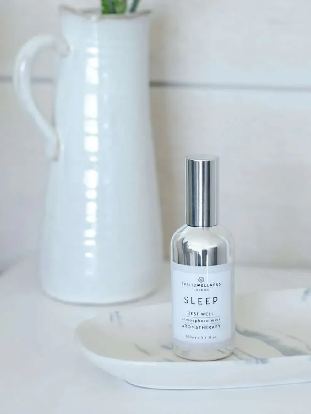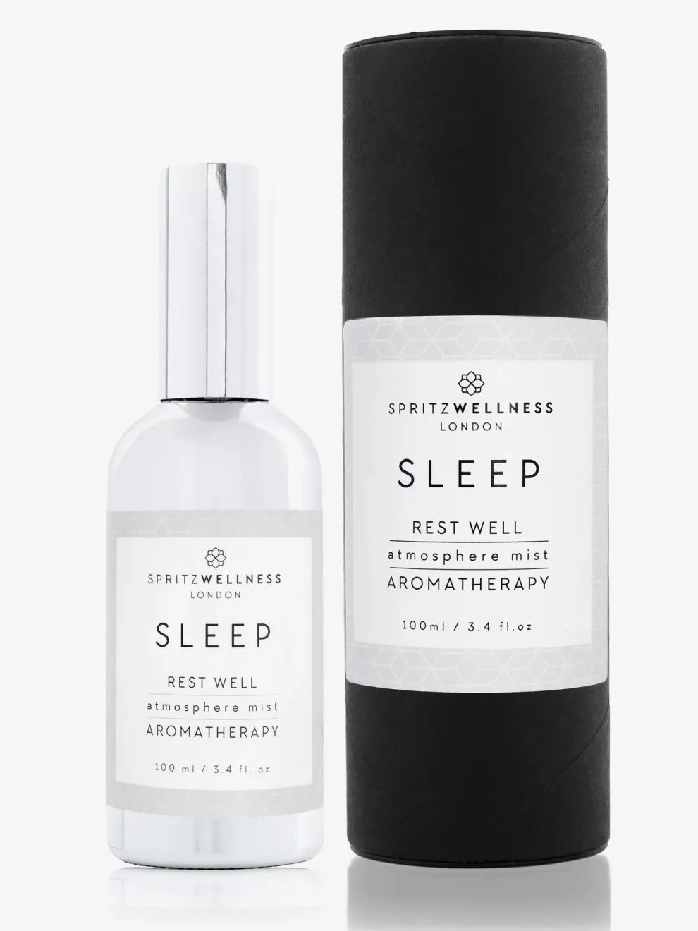 Spritz Wellness Sleep Atmosphere Mist helps you to wind down and drift off with a unique blend of relaxing, soothing and calming scents – a natural remedy of Lavender, Mandarin, Ravensara, and Chamomile to promote a solid night’s rest.
