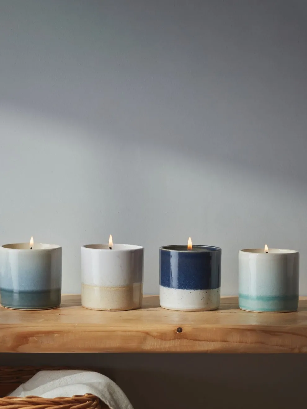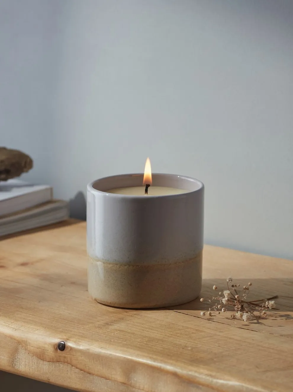 - Ceramic vessel. Vegetable and mineral wax blend, combination of essential oils and nature identical fragrances with lead-free cotton wicks.