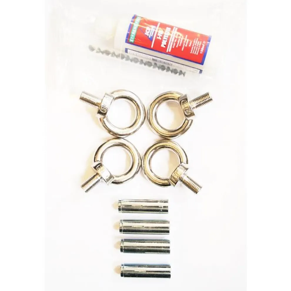 - set includes 4 stainless steel M16 eye bolts, drop in anchors and polyester mortar anchor (glue).