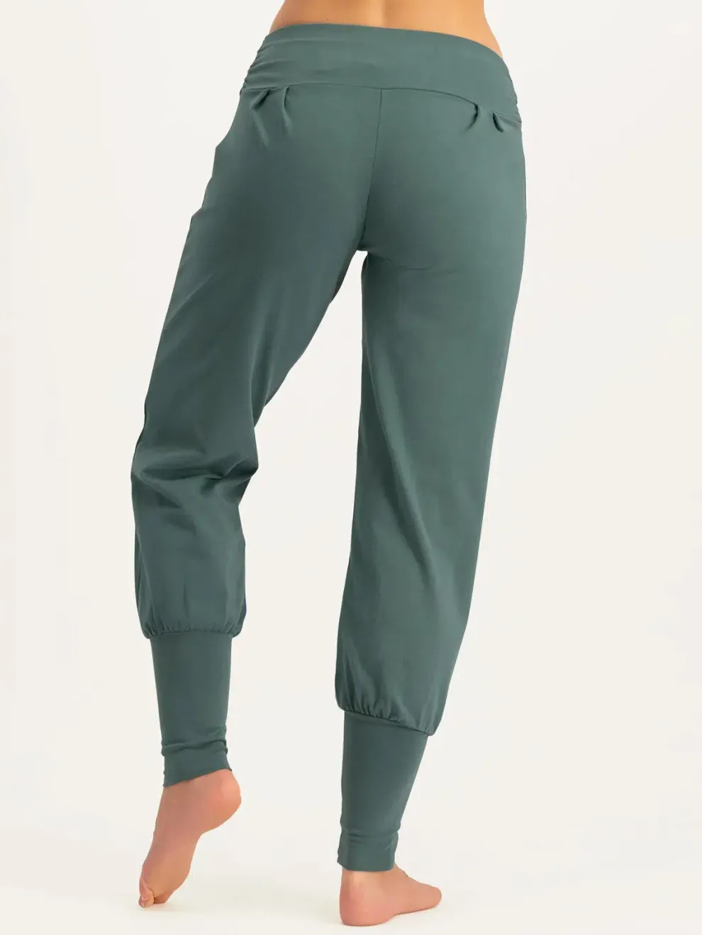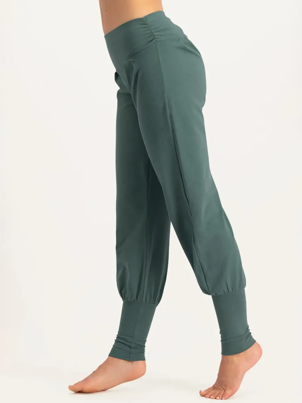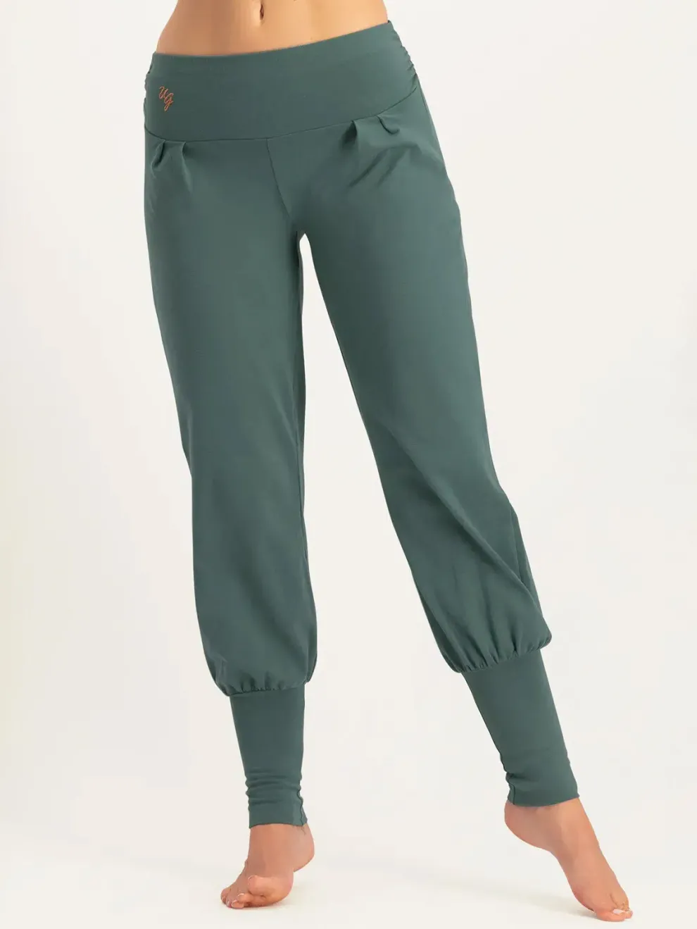 The Aladdin pants revisited, the pants feature a flat belt with shirring on both sides, offering support and elegance to the belly region. The legs of the Dakini pants are wider and then slim again at the ankles with cuffs, so even for your upside-down yoga poses, they will stay put.