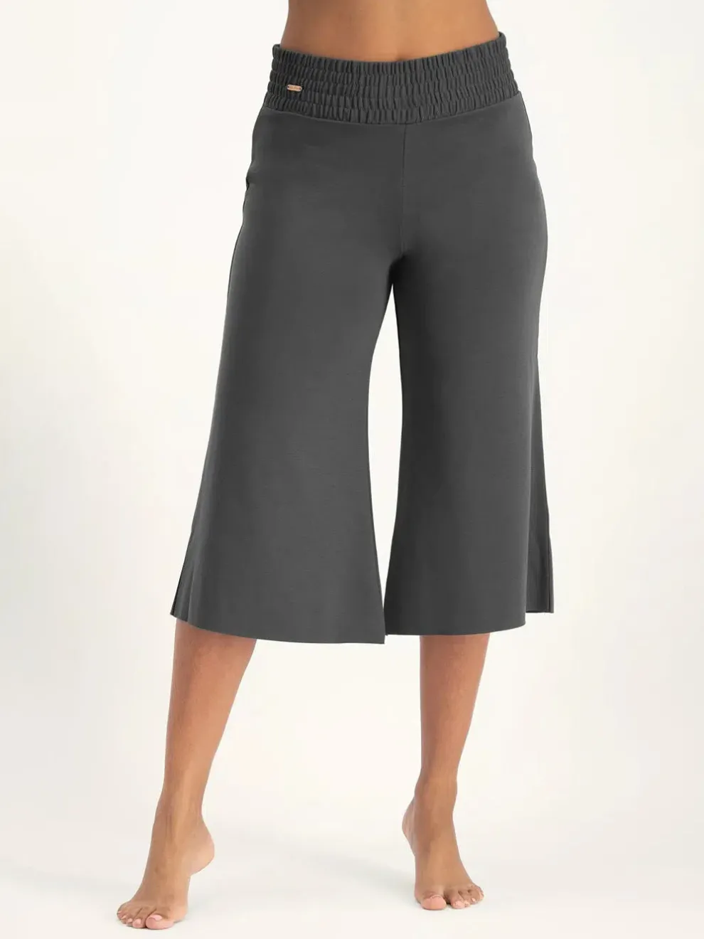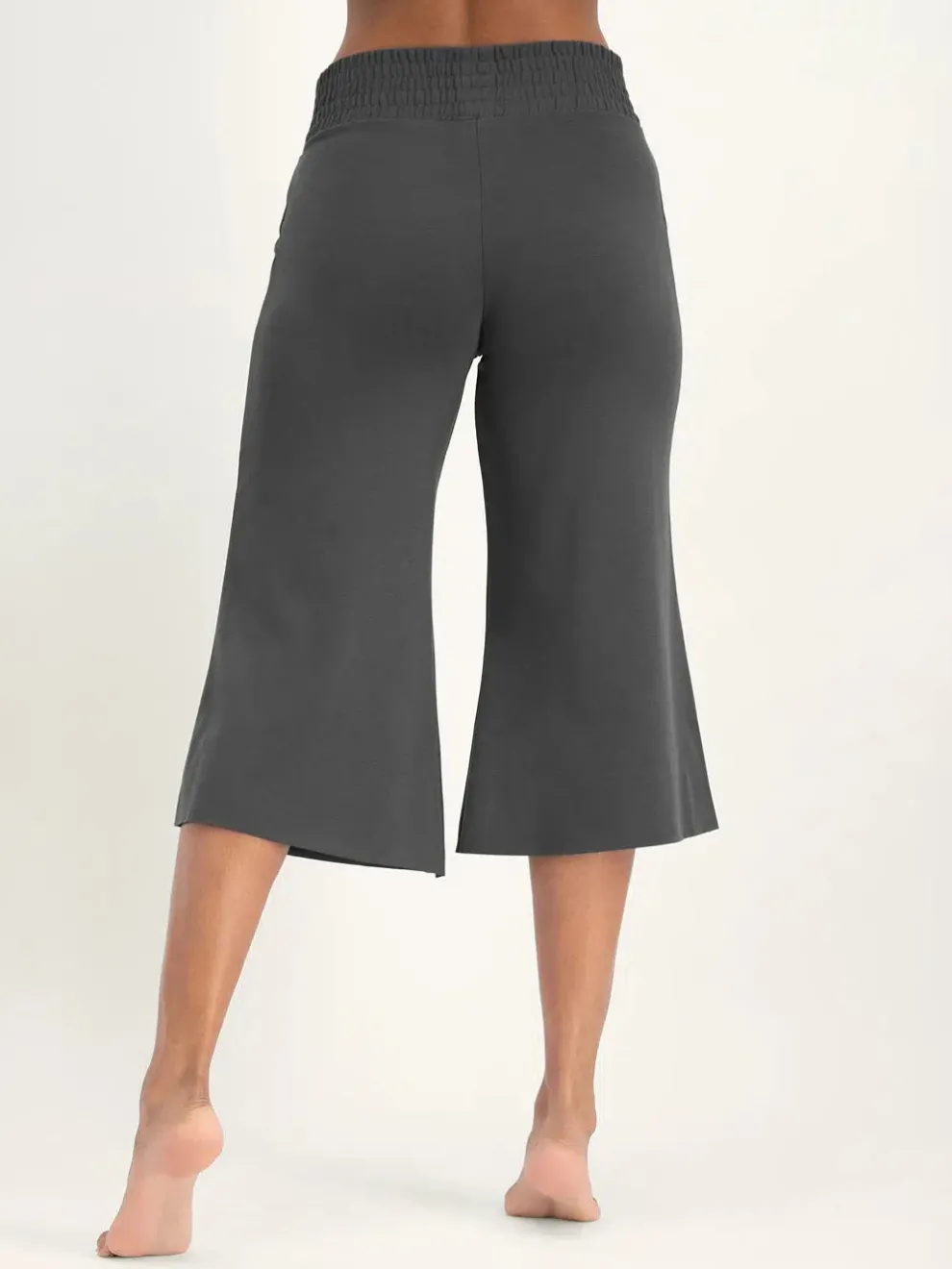 These capri pants are crafted from a premium blend of 48% lyocell, 48% organic cotton, and 4% elastane. They offer the perfect combination of stretch, softness, and breathability. The smocked waistband ensures a comfortable fit that stays in place and with their shorter length and wide legs, these capris are ideal for gentle yoga styles like yin, hatha, restorative, and meditation.