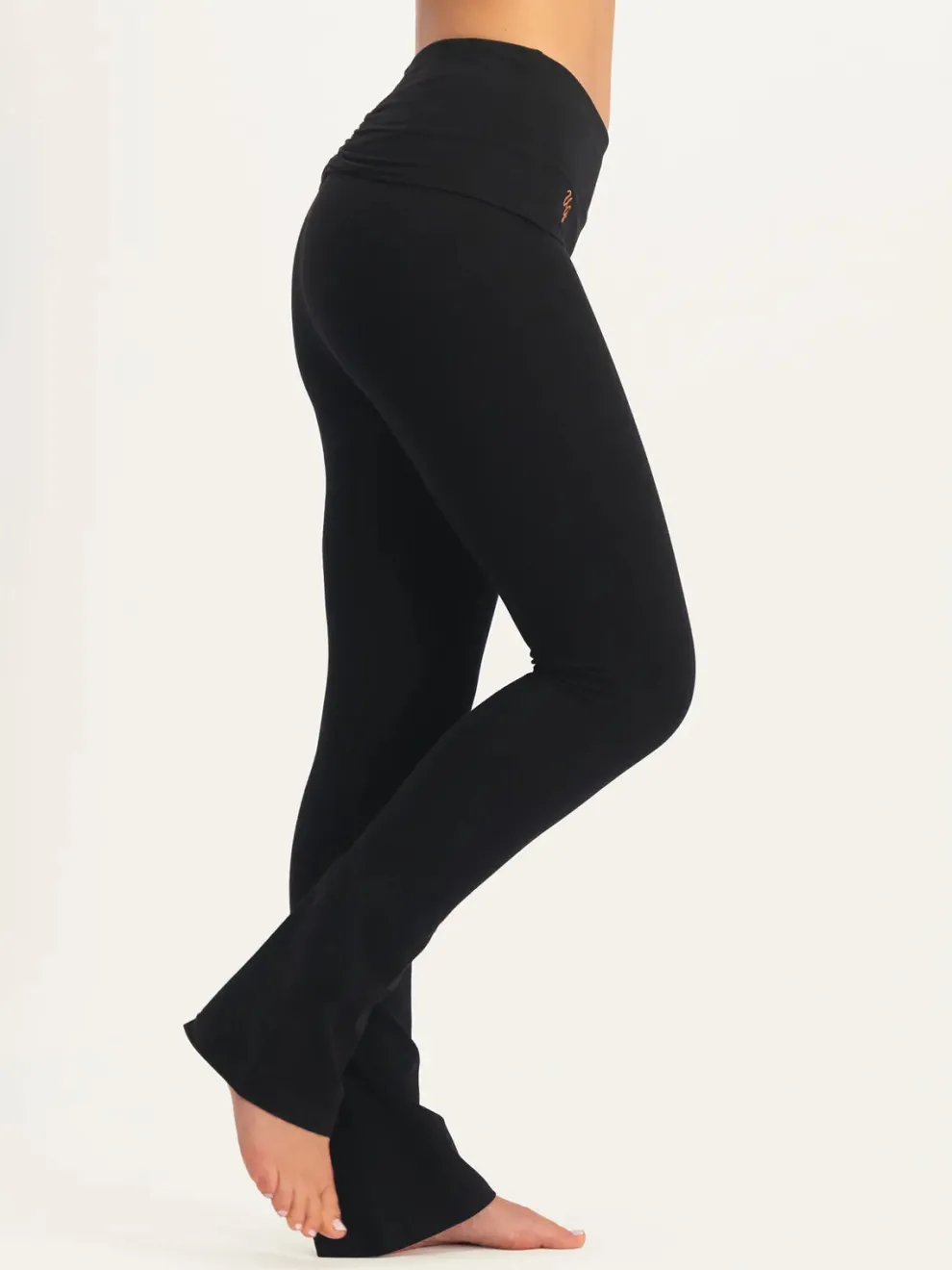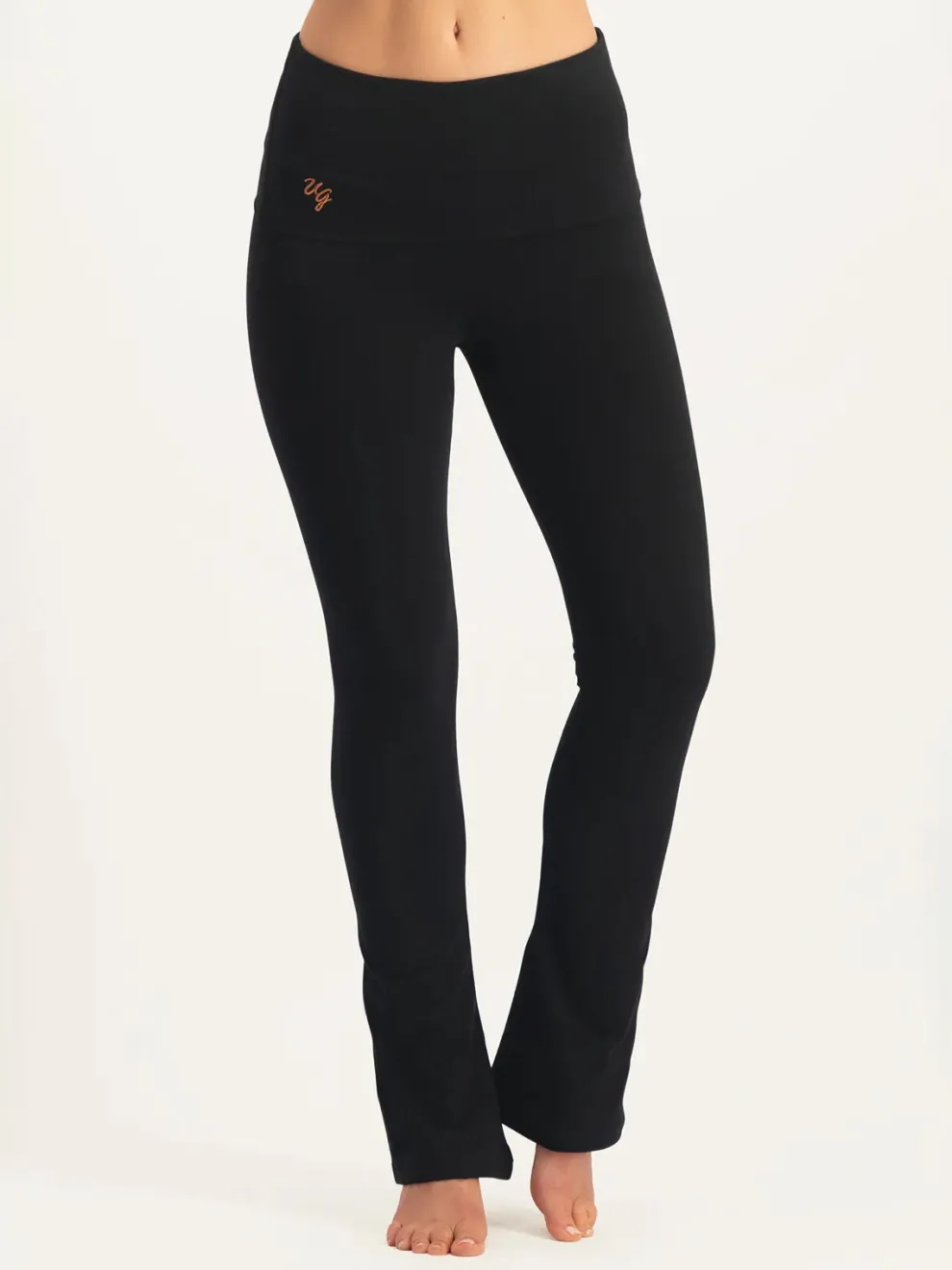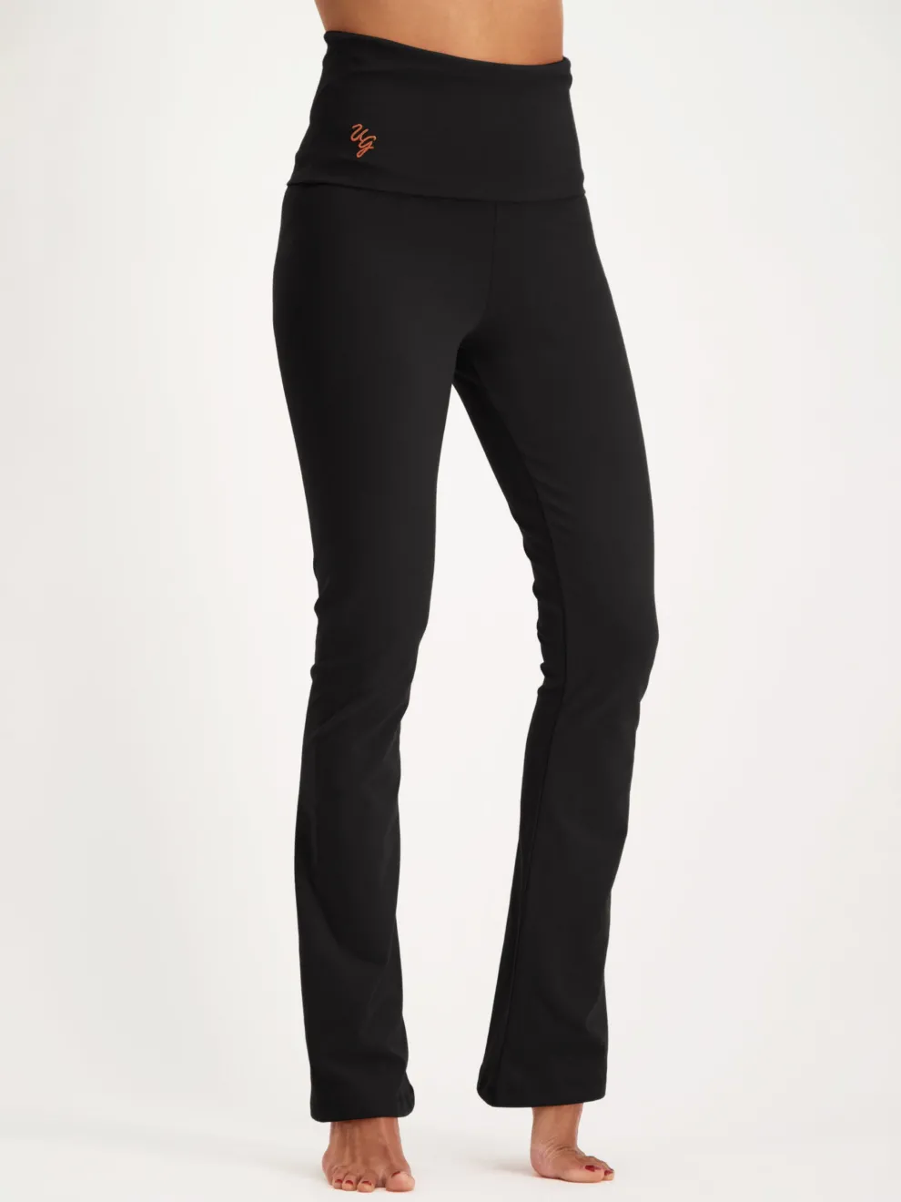 Urban Goddess Pranafied flared yoga pants are made from their signature soft certified cotton. They have a wide fold-over waistband that can also be worn higher to create high-waisted leggings. These pants are perfect for floor yoga (yin, restorative or Pilates) and also work as maternity yoga pants.