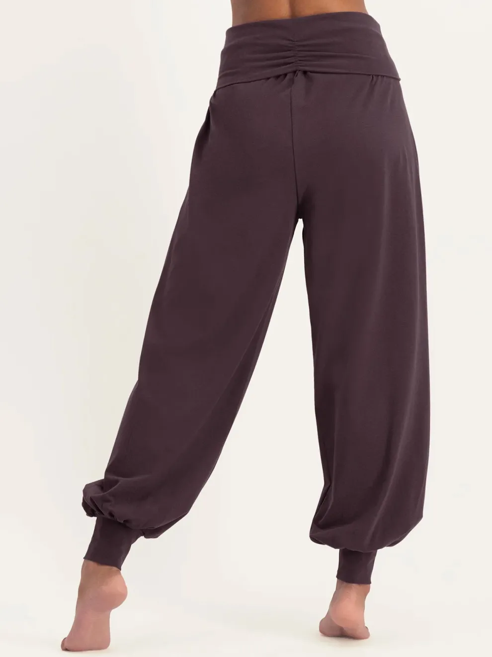 The Rhea yoga pants are stylish yoga pants with a loose fit. The women’s yoga pants have a fine wrap-around waistband and ankle cuffs that keep the pants in place. The soft wrap waistband allows you to style the trousers the way you like: high-or low-waist, whatever you like best!