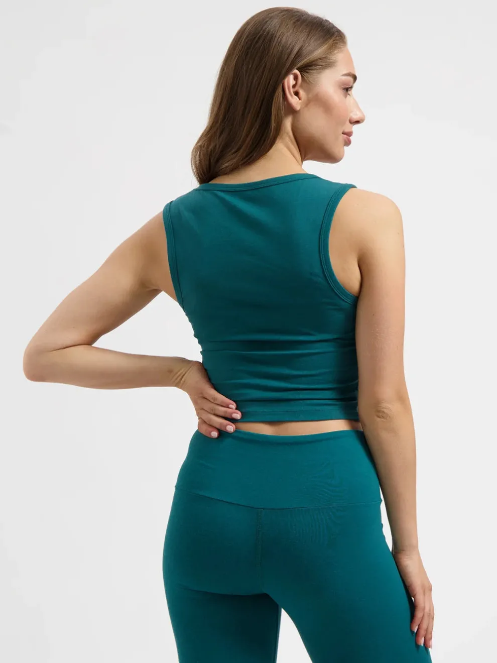 The Seris Yoga Crop Top is a lightweight, cropped yoga top with a straight fit, deep round neckline, and wide armholes. Made from organic cotton and lycra for a breathable, stretchy feel. Perfect for yoga, pilates, or as a sporty layering piece. The Seamoss color adds a fresh, natural vibe.