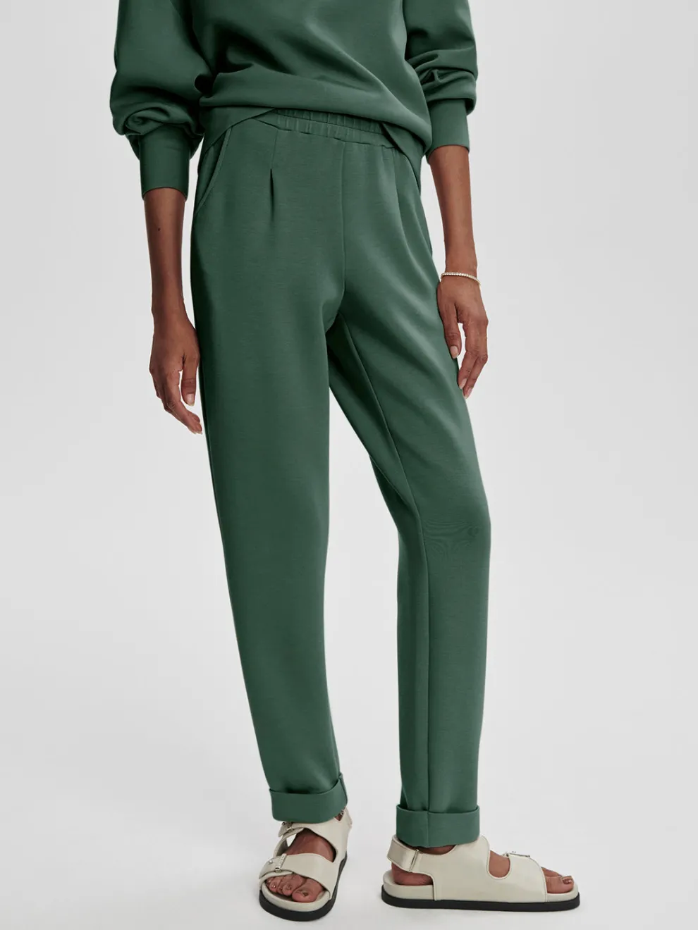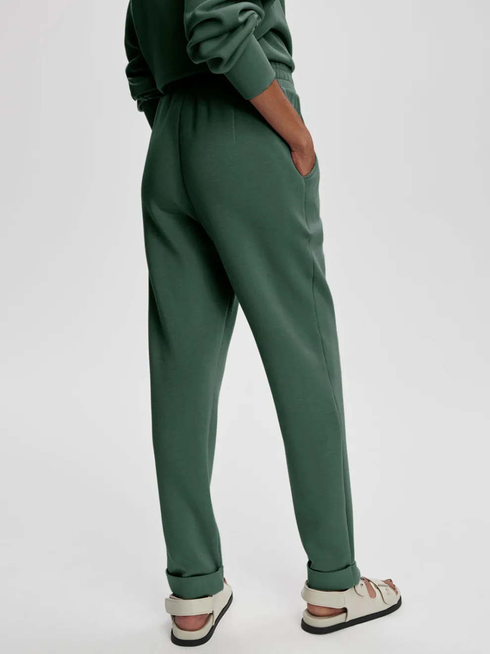Tailored for a slim, tapered fit, these pants feature an elegant, rolled cuff, shaped pockets, and flattering front and back darts at the waistband for an elevated touch. Perfect for pairing with DoubleSoft sweaters, they are the ultimate wardrobe essential.