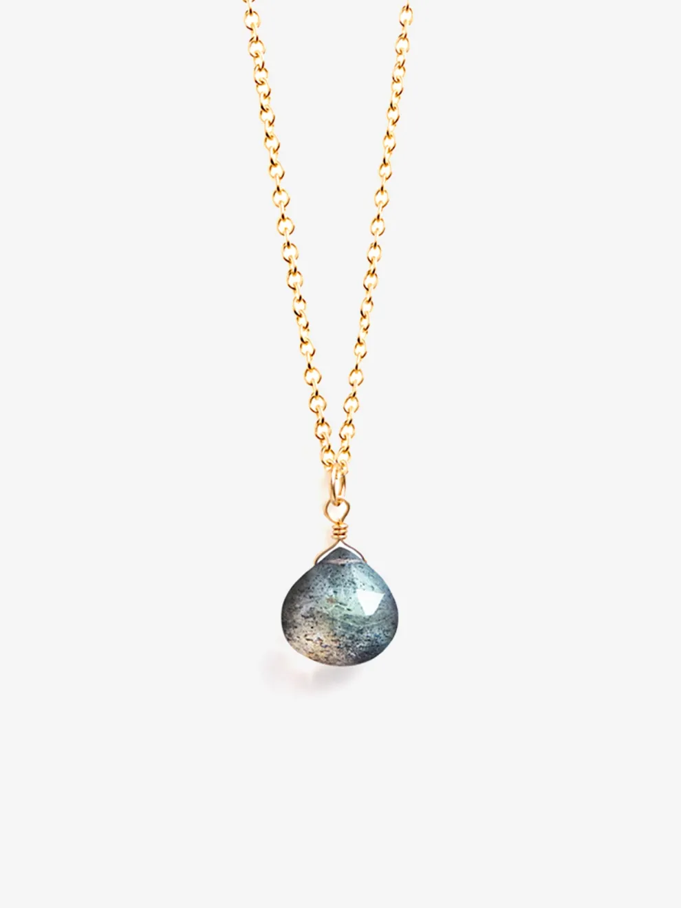 A faceted iridescent labradorite gemstone in Wanderlust’s signature shape floats delicately on a fine gold chain.